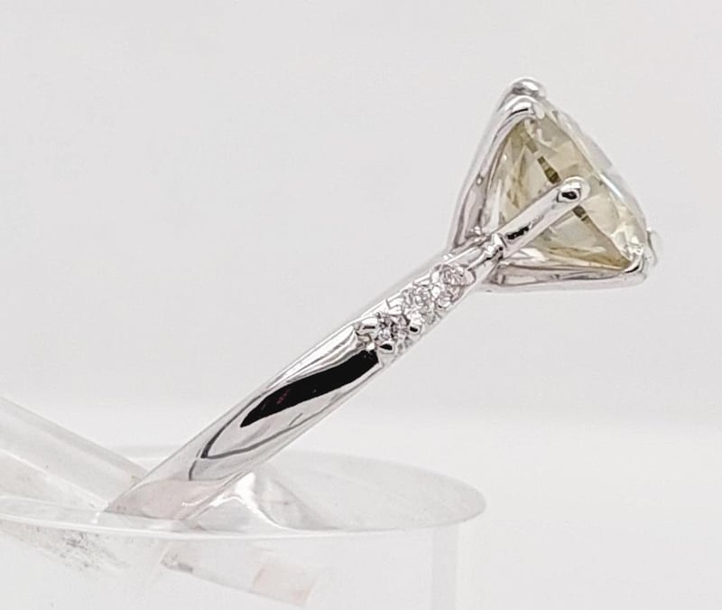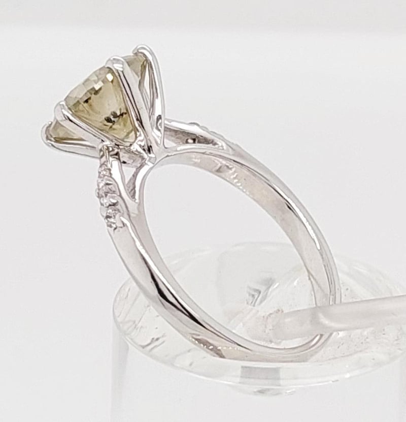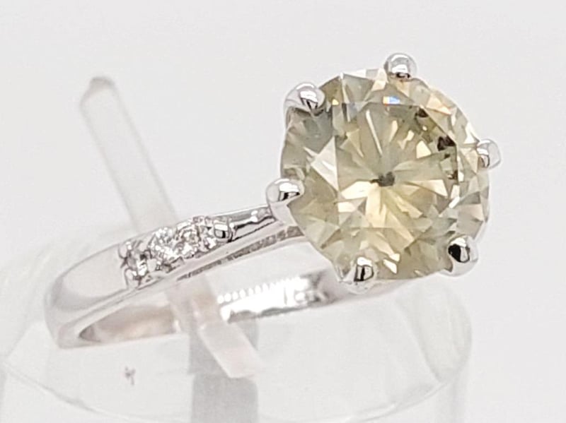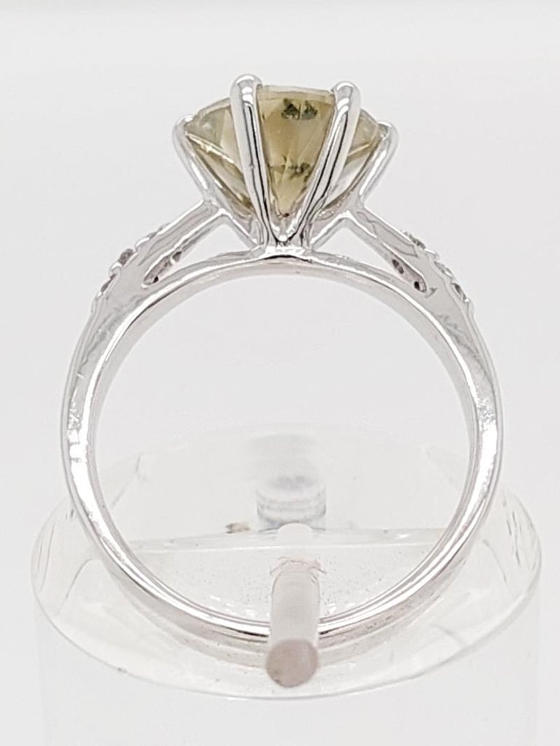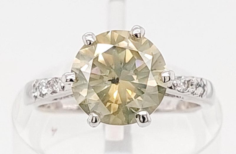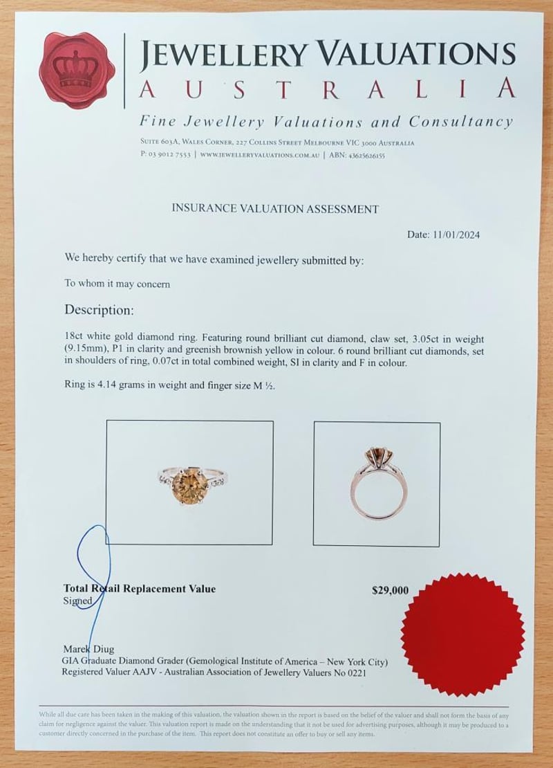 18CT WHITE GOLD DIAMOND RING Total Item Weight: 4.14gms This 18Ct White Gold Diamond Ring Features A 3.05Ct Round Brilliant Cut Claw Set Diamond, Measuring 9.15Mm, P1 In Clarity And Greenish Brownish Yellow In Colour. The Ring Also Features 6 Round Brilliant Cut Diamonds Set In Shoulders Of The Ring, 0.07Ct In Total Combined Weight Si In Clarity And F In Colour.Ring Size: M 1/2 Markings: 18K Jewellery Valuations Provided By A Third Party Professional Not Directly Associated With Lloyds Auctions at AUD $29000This Insurance Valuation has been provided by a registered Jewellery Valuer and is intended for insurance purposes only. The valuation amount has no bearing on the auction value of the item. Any questions regarding the valuation should be directed to the issuing Valuer (refer to contact details on the certificate) as Lloyds have no association or relationship with the Valuer or the valuation amount contained within the valuation. Condition: Excellent- Refer Images 0162901+89CROSSDOCK