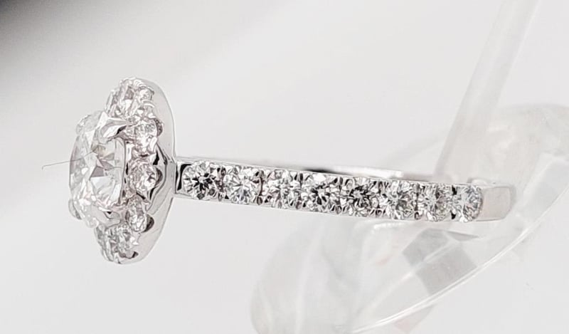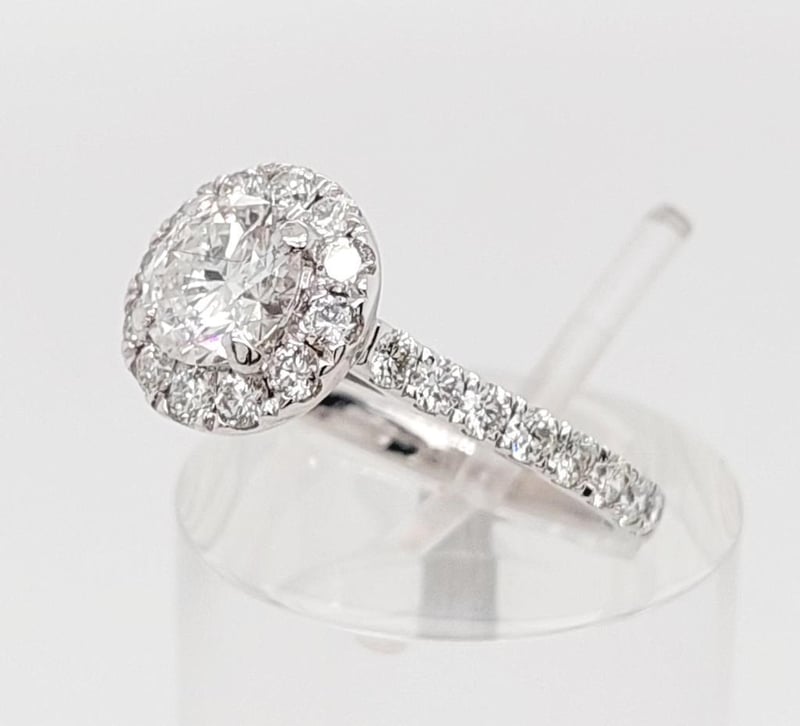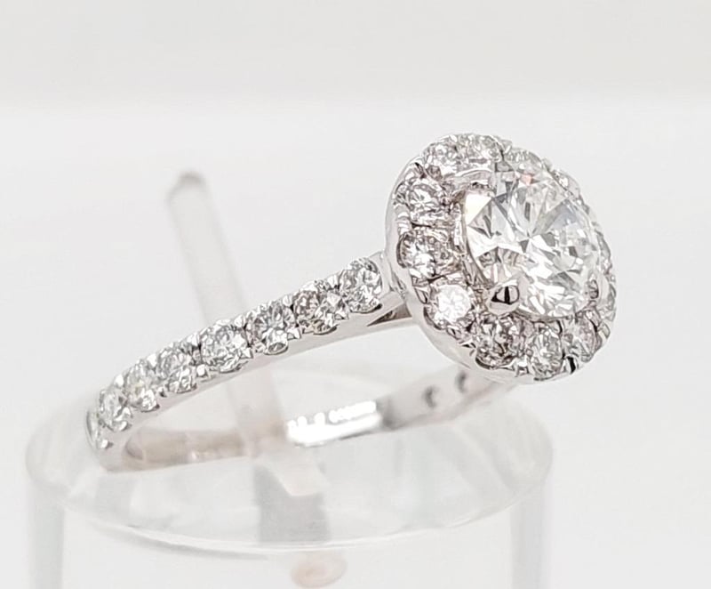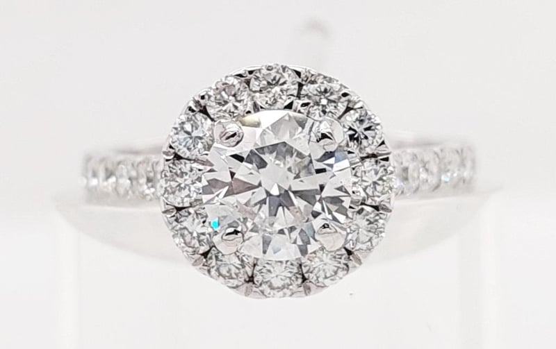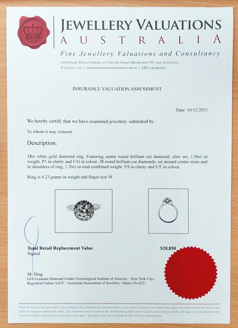 18CT WHITE GOLD DIAMOND RING Total Item Weight: 4.23gms This 18Ct White Gold Diamond Ring Features A Round Brilliant Cut Centre Claw Set Diamond, 1.06Ct In Total Combined Weight P1 In Clarity And F/G In Colour. The Ring Also Features 28 Round Brilliant Cut Diamonds Set Around Centre Stone And In Shoulders Of The Ring, 1.20Ct In Total Combined Weight Vs In Clarity And E/F In Colour. Ring Size: M Markings: 18K Jewellery Valuations Provided By A Third Party Professional Not Directly Associated With Lloyds Auctions at AUD $20850This Insurance Valuation has been provided by a registered Jewellery Valuer and is intended for insurance purposes only. The valuation amount has no bearing on the auction value of the item. Any questions regarding the valuation should be directed to the issuing Valuer (refer to contact details on the certificate) as Lloyds have no association or relationship with the Valuer or the valuation amount contained within the valuation. Condition: Excellent- Refer Images 0162901+91CROSSDOCK