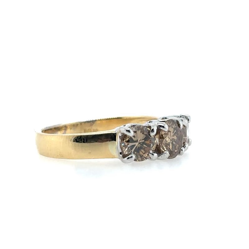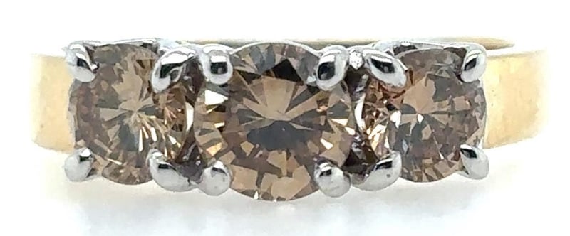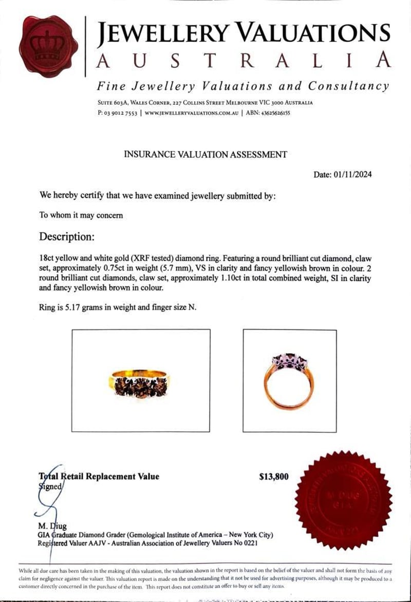 18K TWO TONE GOLD AND DIAMOND RING Total Item Weight: 5.17gms This 18Ct Yellow & White Gold Xrf Tested Ring Features 1 X Approx. 0.75Ct Round Brilliant Cut Claw Set Diamond Measuring 5.7Mm, Clarity: Vs, Colour: Fancy Yellowish Brown. This Ring Also Features 2 X Round Brilliant Cut Claw Set Diamonds, Approx. Tcw: 1.10, Clarity: Si, Colour: Fancy Yellowish Brown.Ring Size: N Jewellery Valuations Provided By A Third Party Professional Not Directly Associated With Lloyds Auctions at AUD $13800This Insurance Valuation has been provided by a registered Jewellery Valuer and is intended for insurance purposes only. The valuation amount has no bearing on the auction value of the item. Any questions regarding the valuation should be directed to the issuing Valuer (refer to contact details on the certificate) as Lloyds have no association or relationship with the Valuer or the valuation amount contained within the valuation. Condition: Excellent- Refer Images 0162901+129CROSSDOCK