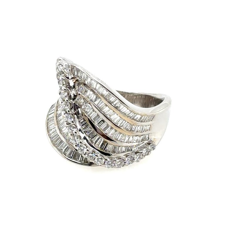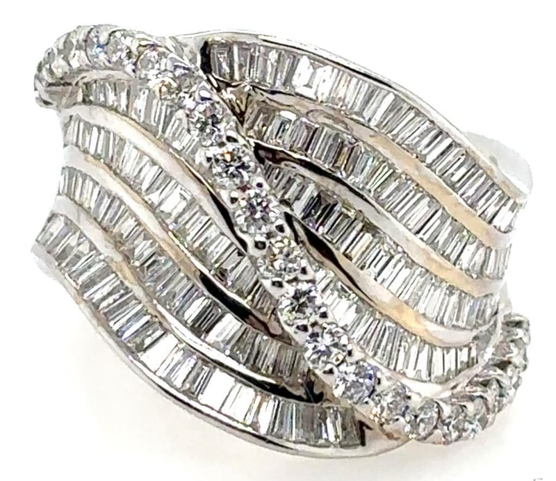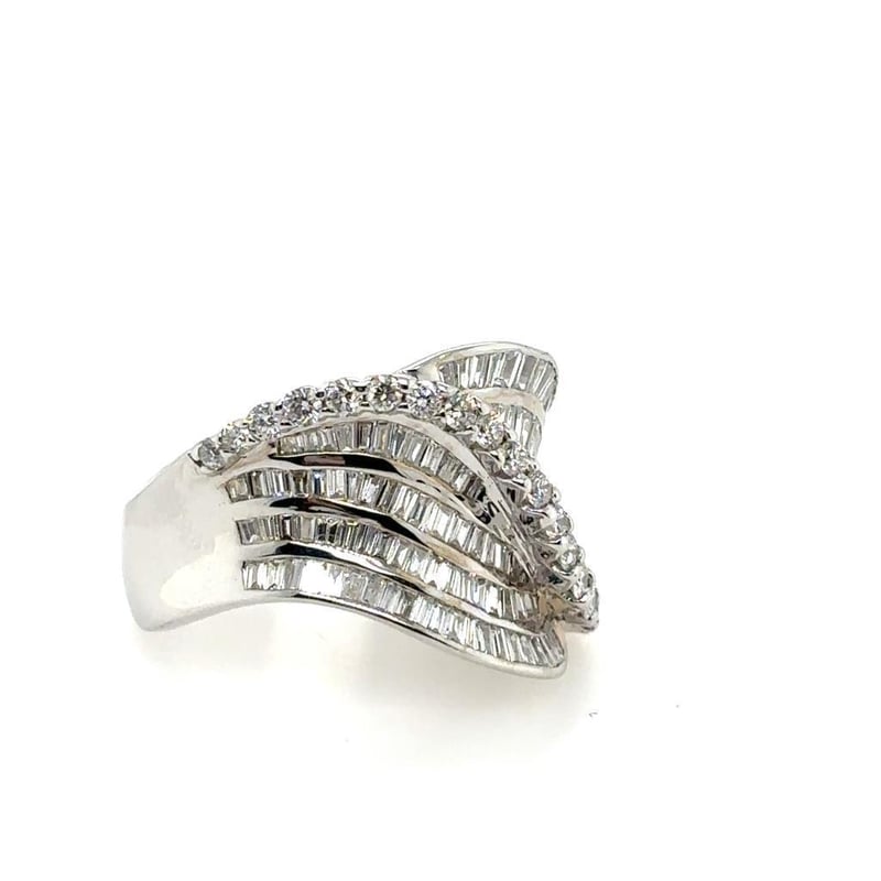 18CT WHITE GOLD AND DIAMOND RING Total Item Weight: 13gms This 18Ct White Gold Ring Features 23 X Round Brilliant Cut Claw Set Diamonds & 138 X Baguette Cut Channel Set Diamonds, 1.80Ct In Total Combined Weight, Vs In Clarity And F In Colour. Jewellery Valuations Provided By A Third Party Professional Not Directly Associated With Lloyds Auctions at AUD $15500This Insurance Valuation has been provided by a registered Jewellery Valuer and is intended for insurance purposes only. The valuation amount has no bearing on the auction value of the item. Any questions regarding the valuation should be directed to the issuing Valuer (refer to contact details on the certificate) as Lloyds have no association or relationship with the Valuer or the valuation amount contained within the valuation. Condition: Excellent- Refer Images 0162901+168CROSSDOCK