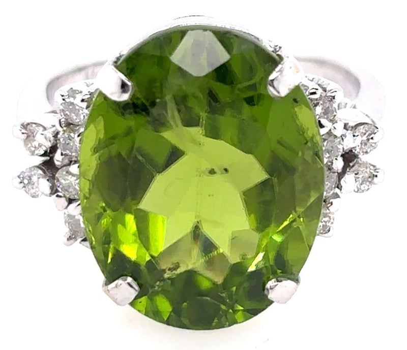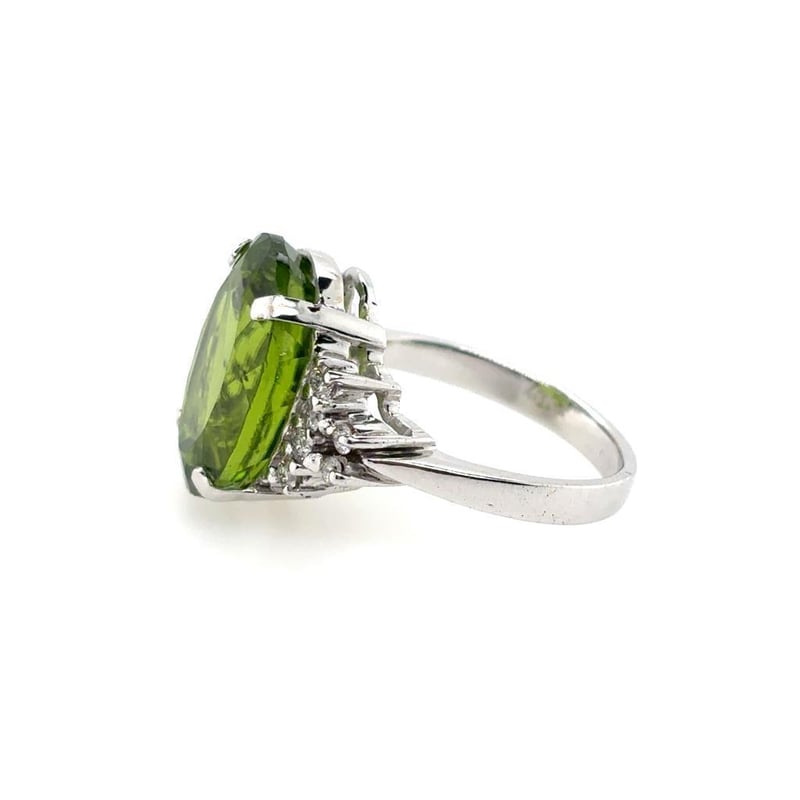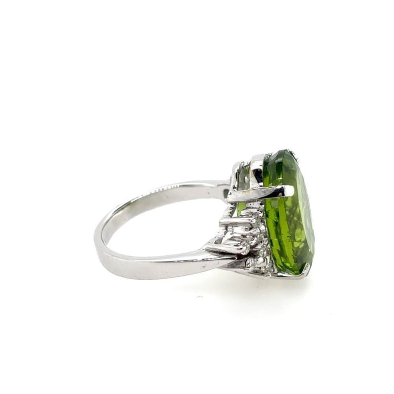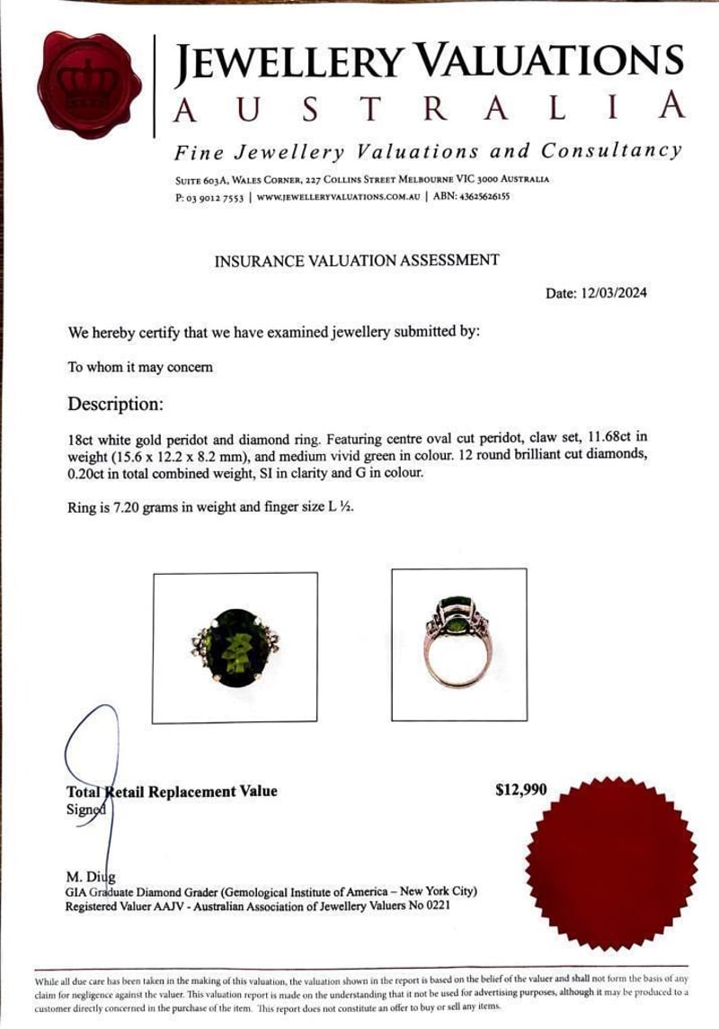 18CT WHITE GOLD PERIDOT AND DIAMOND RING Total Item Weight: 7.2gms This 18Ct White Gold Ring Features 1 X 11.68Ct Oval Cut Claw Set Peridot, Measuring 15.6Mm X 12.2Mm X 8.2Mm And Is Medium Vivid Green In Colour With 12 X Round Brilliant Cut Diamonds, 0.20Ct In Total Combined Weight, Si In Clarity And G In Colour.Ring Size: L.5 Jewellery Valuations Provided By A Third Party Professional Not Directly Associated With Lloyds Auctions at AUD $12990This Insurance Valuation has been provided by a registered Jewellery Valuer and is intended for insurance purposes only. The valuation amount has no bearing on the auction value of the item. Any questions regarding the valuation should be directed to the issuing Valuer (refer to contact details on the certificate) as Lloyds have no association or relationship with the Valuer or the valuation amount contained within the valuation. Condition: Excellent- Refer Images 0162901+165CROSSDOCK