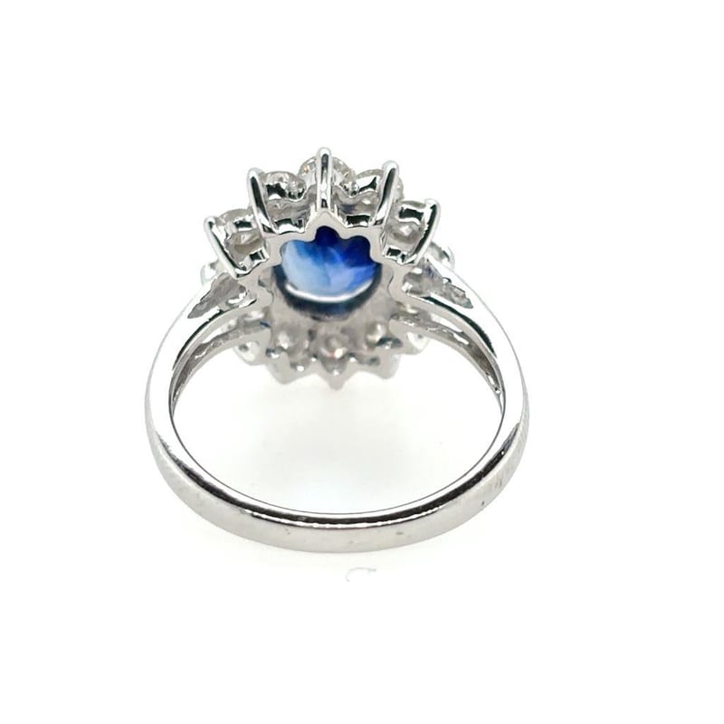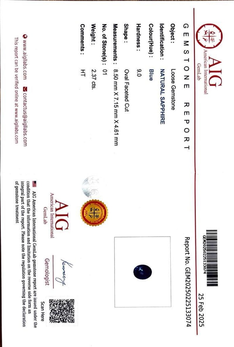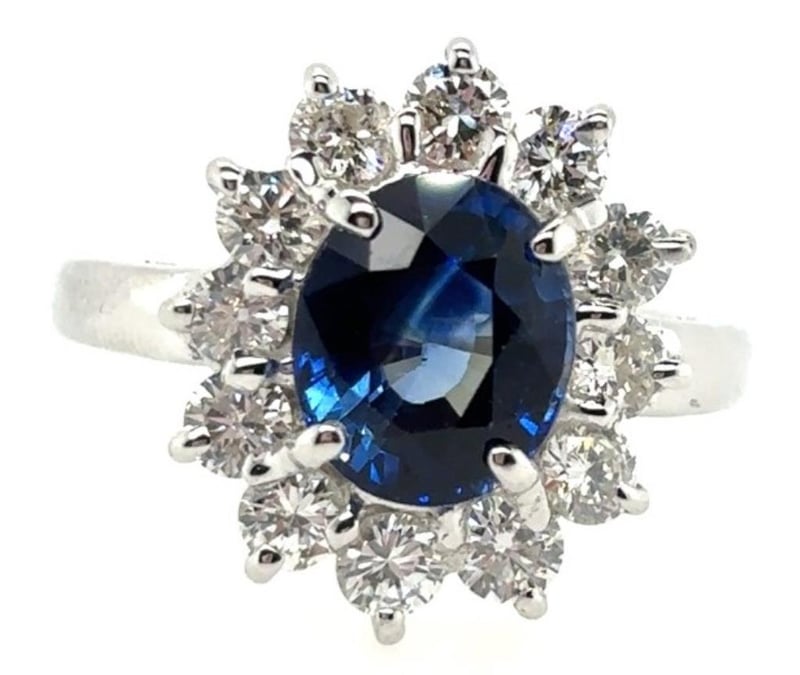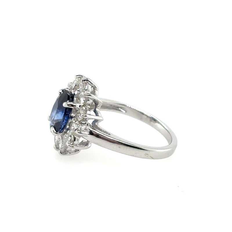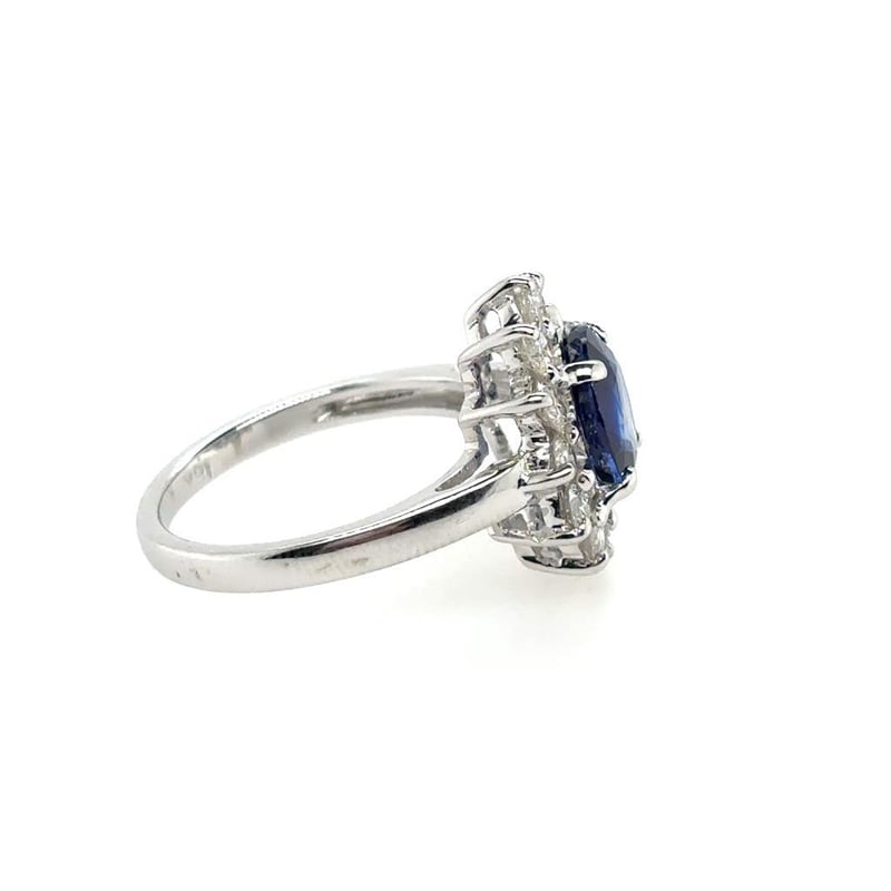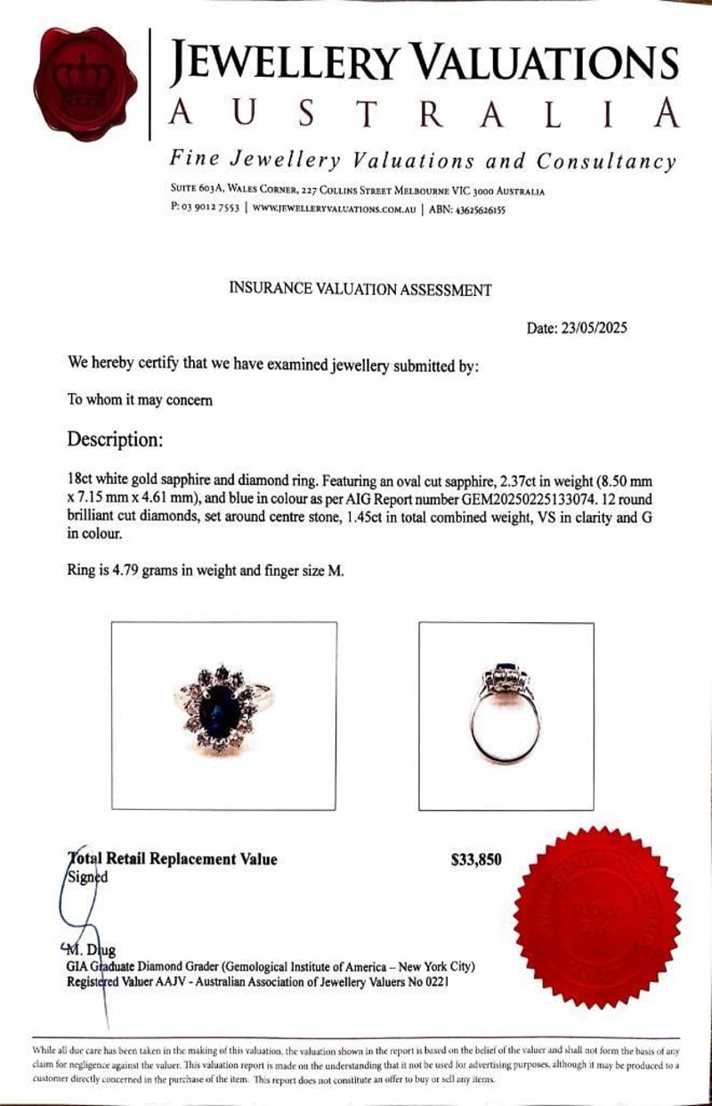 18KT WHITE GOLD SAPPHIRE AND DIAMOND RING Total Item Weight: 4.79gms Featuring An Oval Cut Sapphire, 2.37Ct In Weight (8.50 Mm X 7.15 Mm X 4.61 Mm), And Blue In Colour As Per Aig Report Number Gem20250225133074. 12 Round Brilliant Cut Diamonds, Set Around Centre Stone, 1.45Ct In Total Combined Weight, Vs In Clarity And G In Colour. Finger Size M. Jewellery Valuations Provided By A Third Party Professional Not Directly Associated With Lloyds Auctions at AUD $33850This Insurance Valuation has been provided by a registered Jewellery Valuer and is intended for insurance purposes only. The valuation amount has no bearing on the auction value of the item. Any questions regarding the valuation should be directed to the issuing Valuer (refer to contact details on the certificate) as Lloyds have no association or relationship with the Valuer or the valuation amount contained within the valuation. Condition: Excellent- Refer Images 0162901+222CROSSDOCK