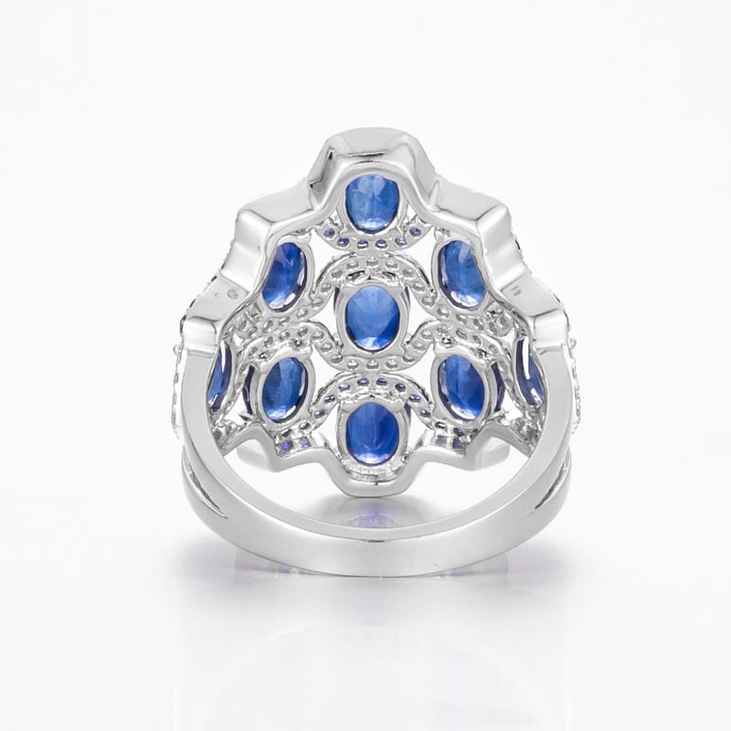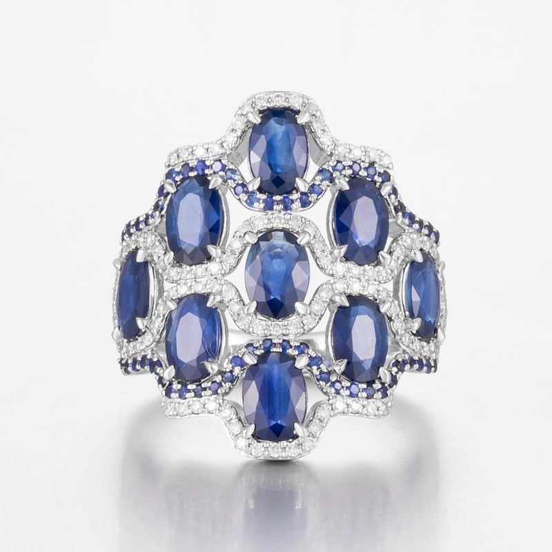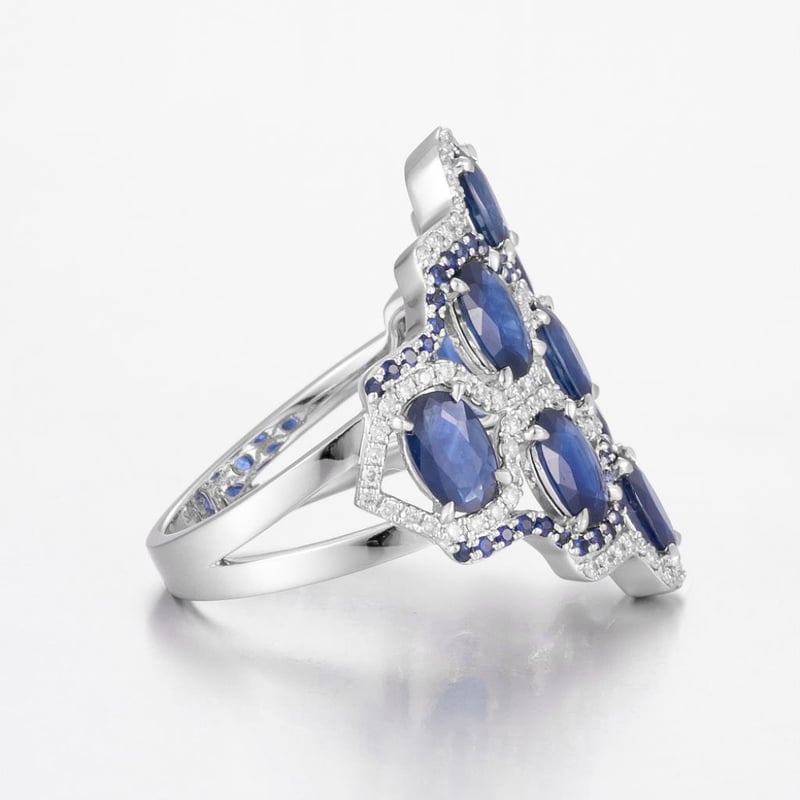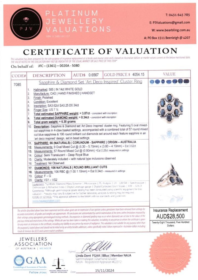 14CT WHITE GOLD AUSTRALIAN SAPPHIRE AND DIAMOND ART DECO STYLE RING FEATURING CENTRE, 66 OVAL CUT, DEEP ROYAL BLUE AUSTRALIAN SAPPHIRES (3.87CT TSW, MODERATELY INCLUDED), CLAW SET, WITH 106 ROUND BRILLIANT CUT DIAMONDS (0.34CT TDW, F-G COLOUR, VS1-VS2 CLARITY), BEAD SET. RING SIZE O.