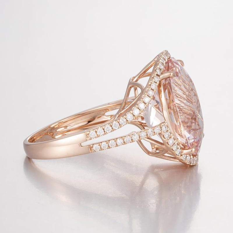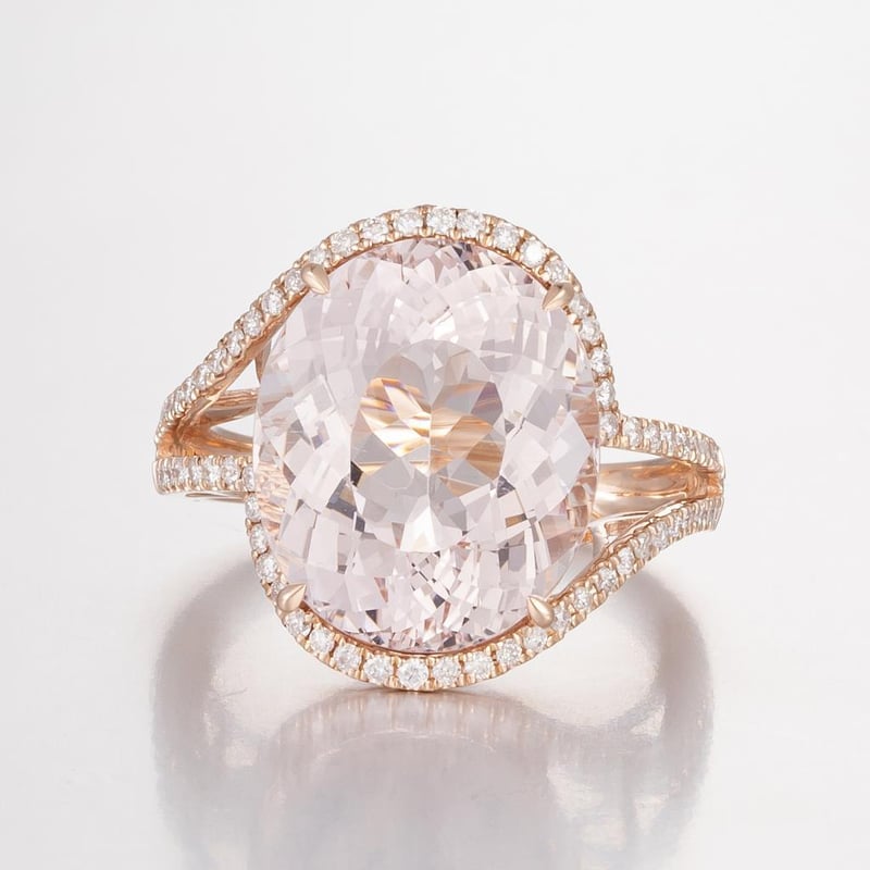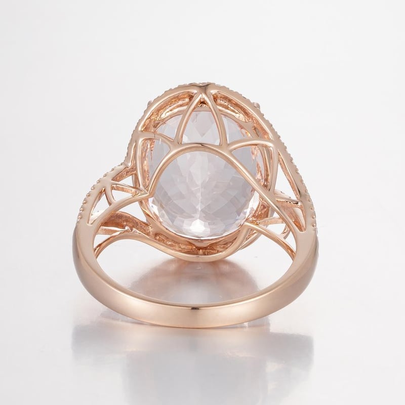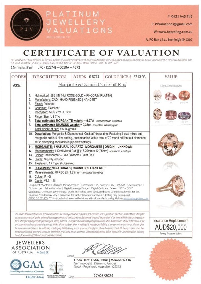 14CT ROSE GOLD MORGANITE AND DIAMOND COCKTAIL RING FEATURING CENTRE, ONE OVAL CUT, PALE BLOSSOM/ FAINT PINK MORGANITE (9.27CT, SLIGHTLY INCLUDED), CLAW SET, WITH 70 ROUND BRILLIANT CUT DIAMONDS (0.35CT TDW, F-G COLOUR, VS2-SI1 CLARITY), PIP CLAW SET. RING SIZE O. Valuations Provided by an Independent Third-Party Professional Not Directly Associated With Lloyds Auctions at AUD $20000This valuation has been conducted by an independent third-party professional. The valuation amount is an assessment by the issuing valuer and does not reflect the auction value of the item. Any inquiries regarding the valuation should be directed to the issuing valuer (refer to contact details on the certificate), as Lloyds Auctions has no affiliation or influence over the valuation, the valuer, or the stated amount. Condition: Good - Refer Images 0586200+489