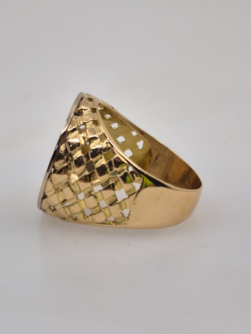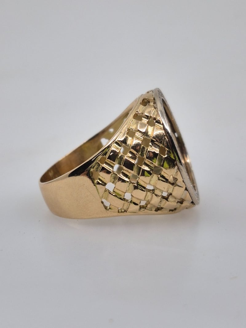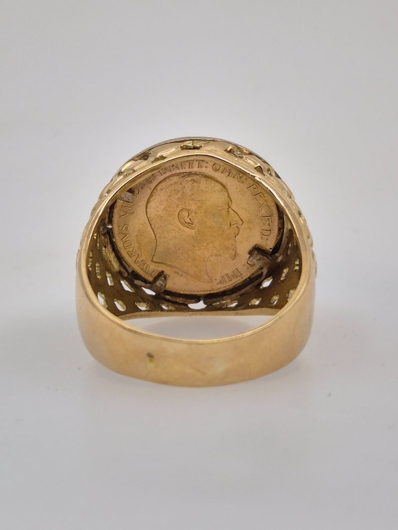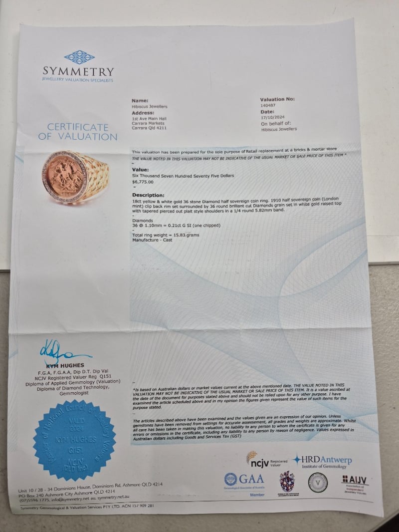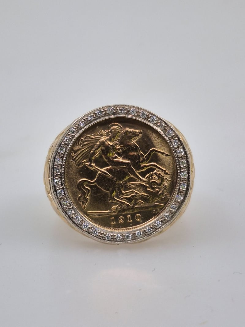 18CT YELLOW AND WHITE GOLD DIAMOND HALF SOVEREIGN RING 18Ct Yellow And White Gold 36 Diamond Half Sovereign Coin Ring. 1910 Half Sovereign Coin (London Mint) Clip Back Rim Set Surrounded By 36 Round Brilliant Cut Diamonds Grain Set In White Gold Raised Top With Tapered Pieced Out Plait Style Shoulders In 1/4 Round 5.82Mm Band. Total Item Weight: 15.83g Markings: 18K Condition: Good - Refer To Images This valuation has been conducted by an independent third-party professional. The valuation amount is an assessment by the issuing valuer and does not reflect the auction value of the item. Any inquiries regarding the valuation should be directed to the issuing valuer (refer to contact details on the certificate), as Lloyds Auctions has no affiliation or influence over the valuation, the valuer, or the stated amount. Insurance Replacement Valuation Amount: $6,775.00 586167+1
