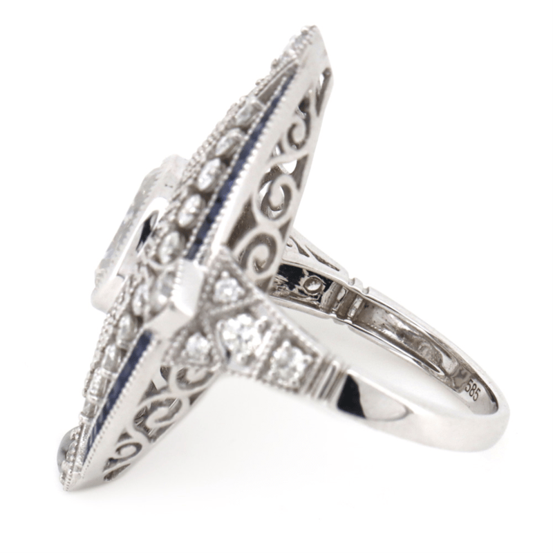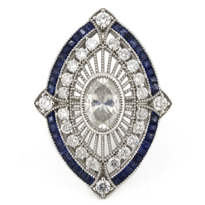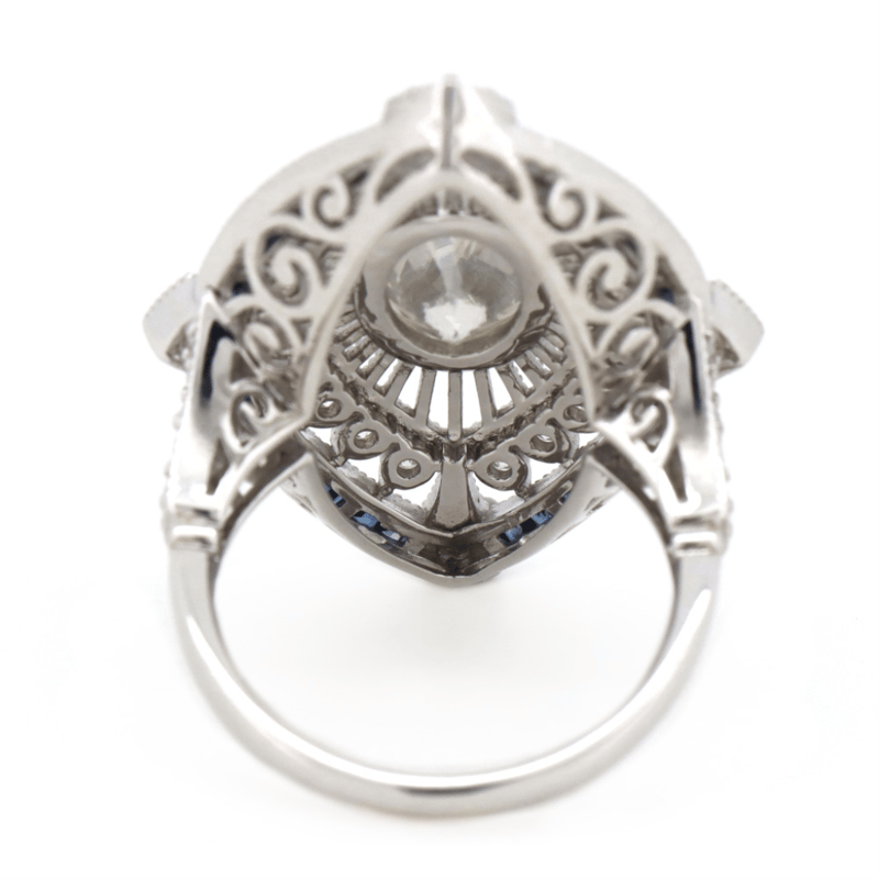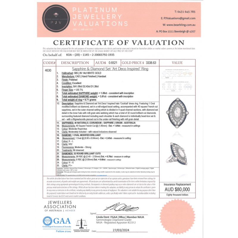 14K WHITE GOLD, BLUE SAPPHIRE AND DIAMOND, ART DECO INSPIRED RING. THE CENTRE FEATURES, ONE OVAL MODIFIED BRILLIANT CUT, DIAMOND (2.43CT, K-L COLOUR, VS2 CLARITY), BEZEL SET. SURROUNDING THE CENTRE ARE, 32 ROUND BRILLIANT CUT, DIAMONDS (1.38CT TDW, H-K COLOUR, P1+ CLARITY), CLAW SET. BORDERING THE CENTRE ARE, 40 SQUARE FRENCH CUT, MODERATE ROYAL BLUE, SAPPHIRES (1.09CT TSW, MODERATELY INCLUDED), CHANNEL SET. RING SIZE O 1/2. Valuations Provided by an Independent Third-Party Professional Not Directly Associated With Lloyds Auctions at AUD $80000This valuation has been conducted by an independent third-party professional. The valuation amount is an assessment by the issuing valuer and does not reflect the auction value of the item. Any inquiries regarding the valuation should be directed to the issuing valuer (refer to contact details on the certificate), as Lloyds Auctions has no affiliation or influence over the valuation, the valuer, or the stated amount. Condition: Good - Refer Images 0645857+5233