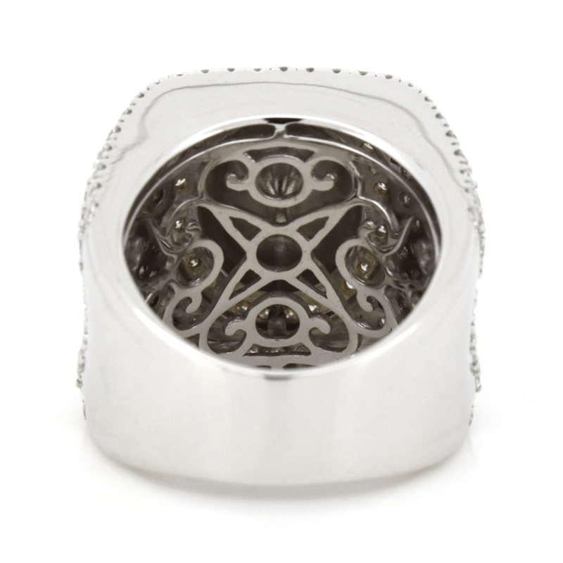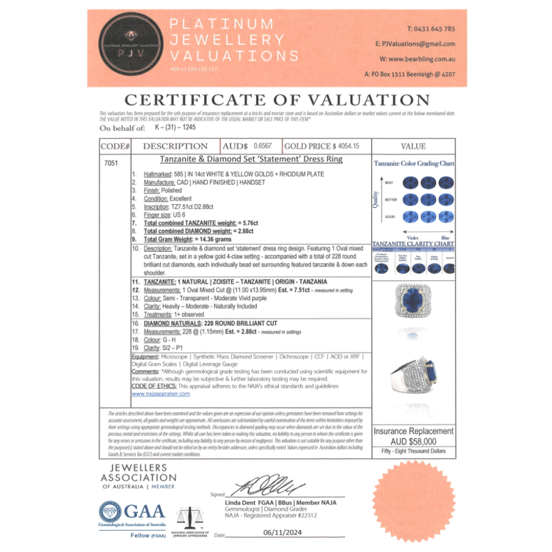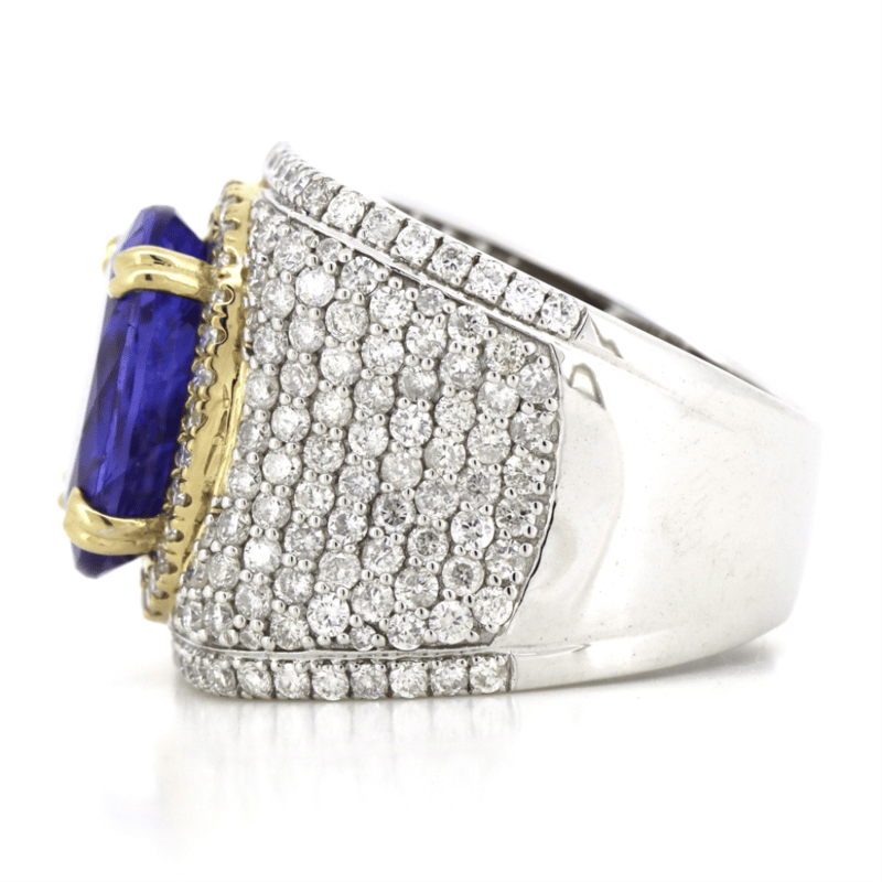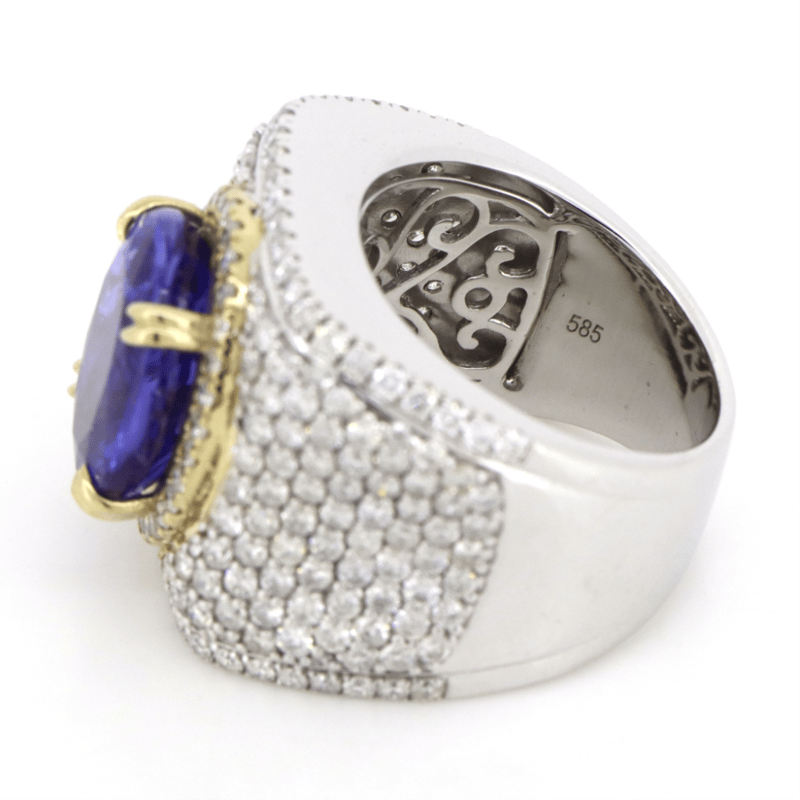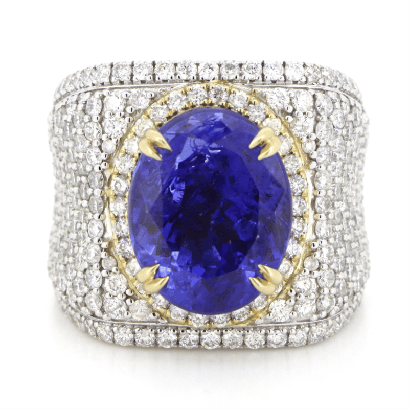 14K WHITE/YELLOW GOLD, 7.51CT TANZANITE AND DIAMOND, STATEMENT RING. THE CENTRE FEATURES, ONE OVAL CUT, MODERATE VIVID PURPLE, TANZANITE (7.51CT, NATURALLY INCLUDED), CLAW SET IN YELLOW GOLD. ENCOMPASSING THE CENTRE AND DECORATING THE BAND ARE, 228 ROUND BRILLIANT CUT, DIAMONDS (2.88CT, G-H COLOUR, SI2-P1 CLARITY), MICRO-BEAD SET IN 14K YELLOW/WHITE GOLD. RING SIZE L1/2.