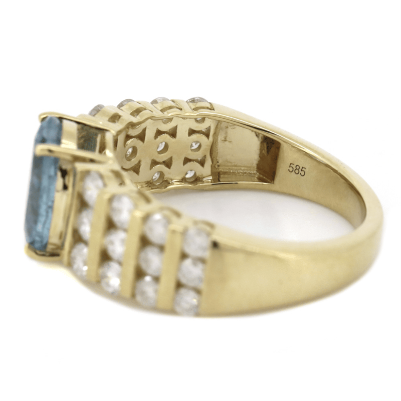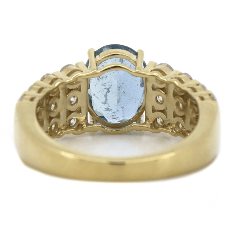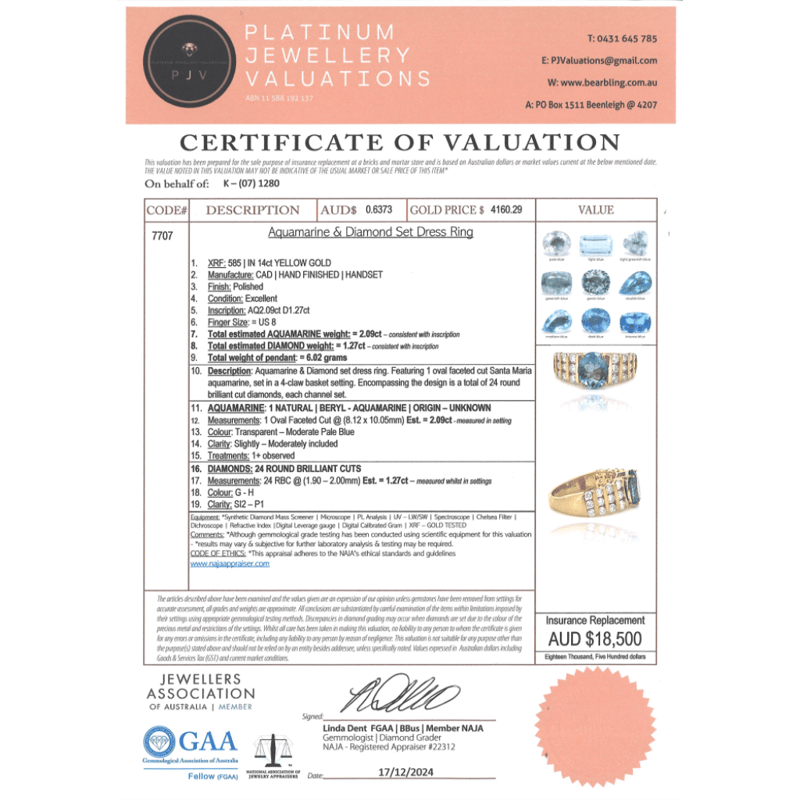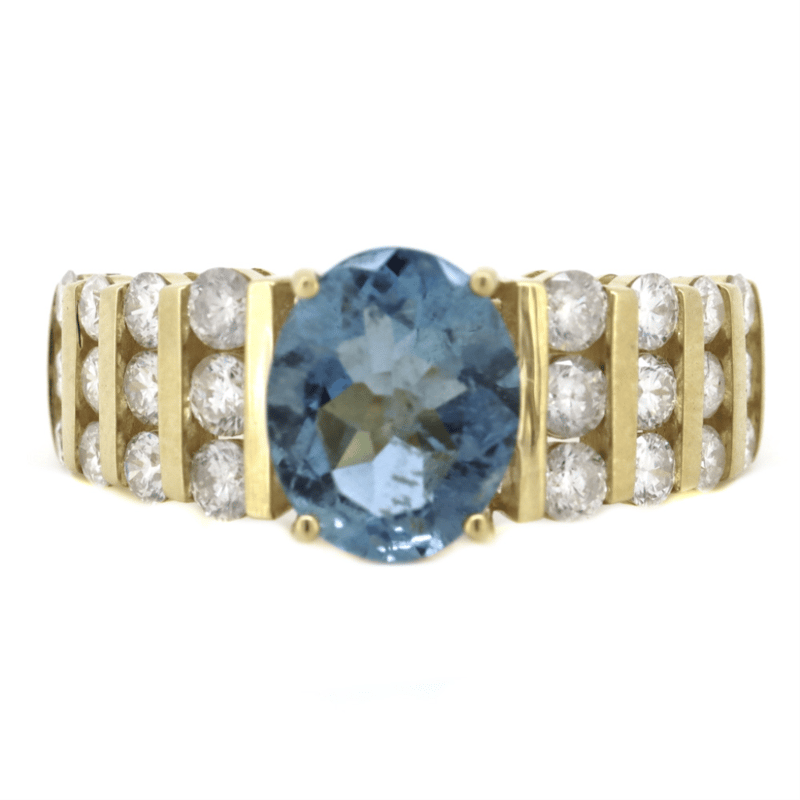 14K YELLOW GOLD, AQUAMARINE AND DIAMOND, DRESS RING. THE CENTRE FEATURES, ONE OVAL FACETED CUT, MODERATE PALE BLUE SANTA MARIA, AQUAMARINE (2.09CT, MODERATELY INCLUDED), 4 CLAW SET. ENCOMPASSING THE DESIGN ARE, 24 ROUND BRILLIANT CUT, DIAMONDS (1.27CT TDW, G-H COLOUR, SI2-P1 CLARITY), CHANNEL SET. RING SIZE P.
