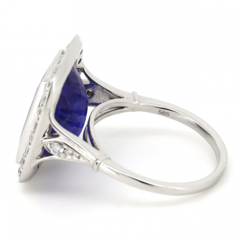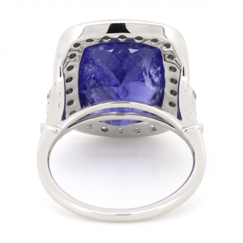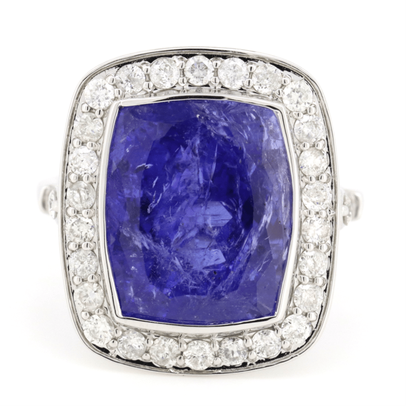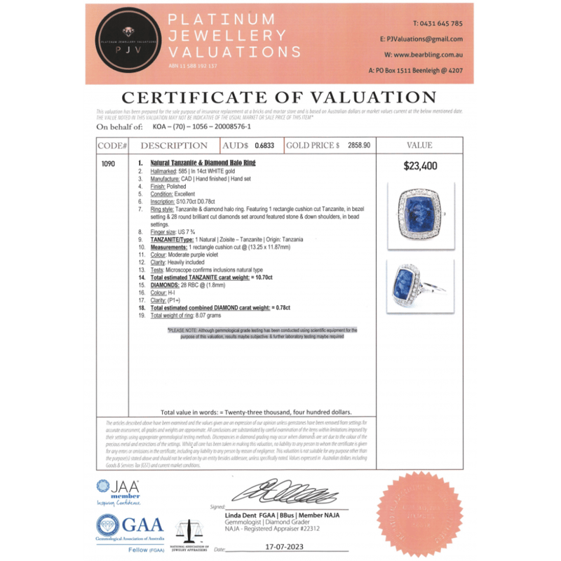 14K WHITE GOLD, 10.70CT TANZANITE AND DIAMOND, STATEMENT RING. THE CENTRE FEATURES, ONE RECTANGULAR CUSHION CUT, MODERATE PURPLE-VIOLET, TANZANITE (10.70CT, HEAVILY INCLUDED), BEZEL SET. SURROUNDING THE CENTRE IN A HALO AND DECORATING THE SHOULDERS ARE, 28 ROUND BRILLIANT CUT, DIAMONDS (0.78CT TDW, H-I COLOUR, P1+ CLARITY), BEAD SET. RING SIZE P.