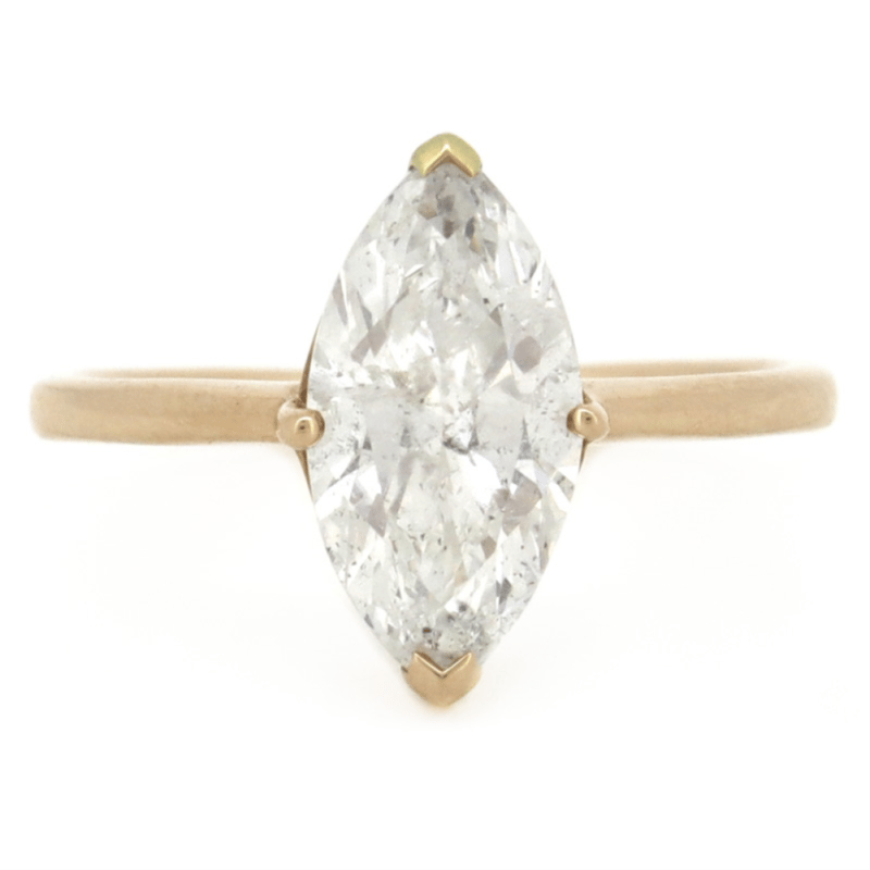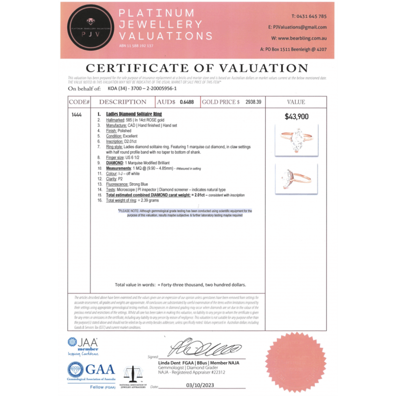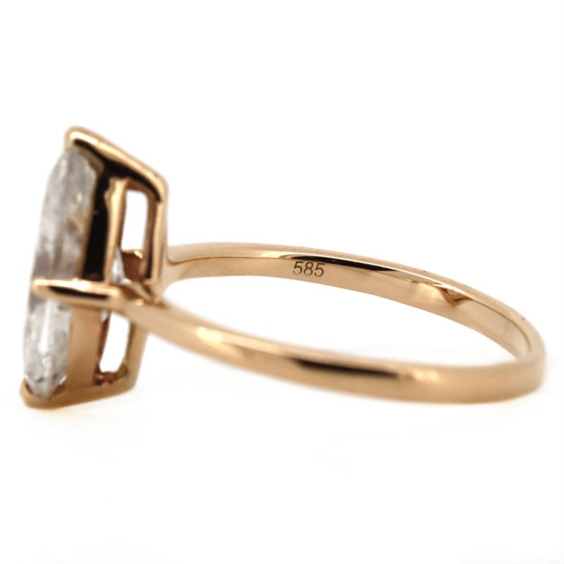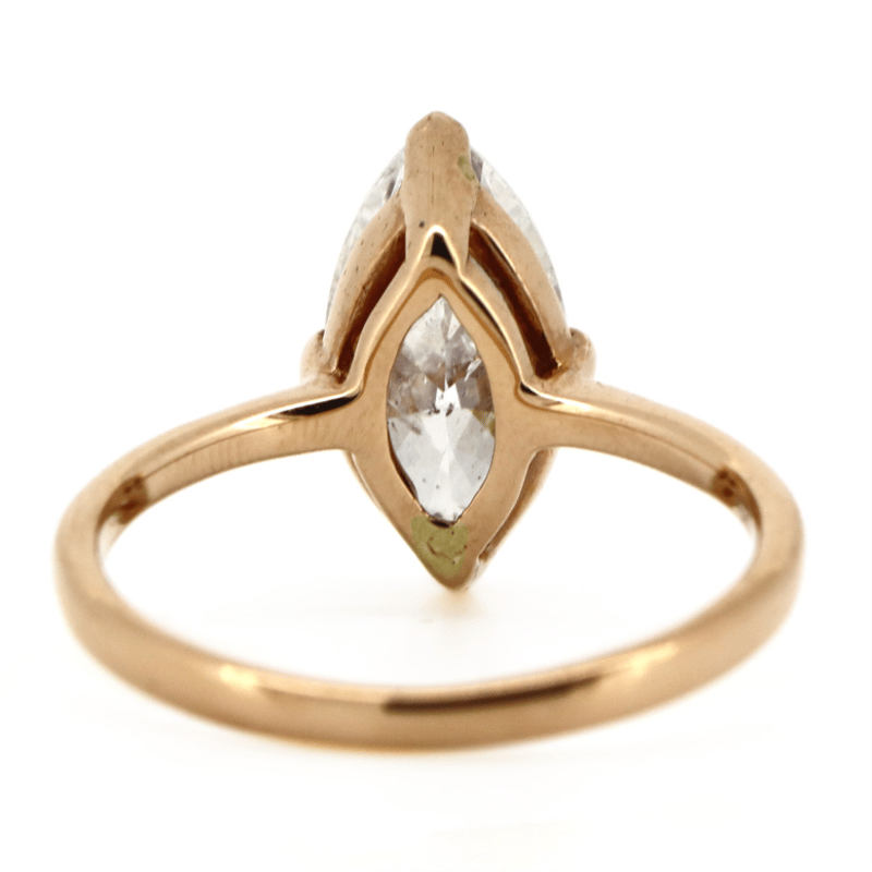 14K ROSE GOLD, 2.01CT DIAMOND, SOLITAIRE RING. THE CENTRE FEATURES, ONE MARQUISE MODIFIED BRILLIANT CUT, DIAMOND (2.01CT, I-J COLOUR, P2 CLARITY), 4 CLAW SET. RING SIZE L 1/2.