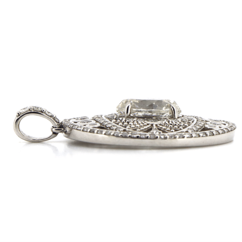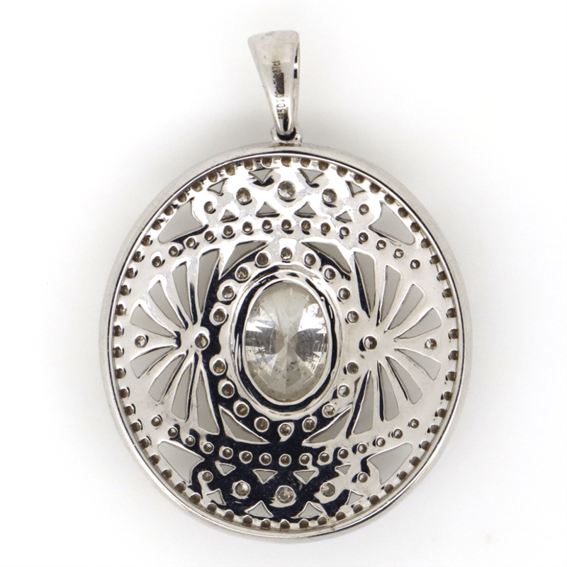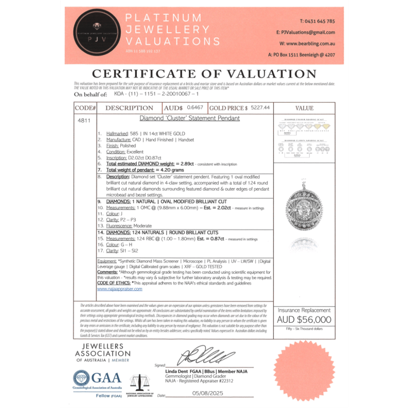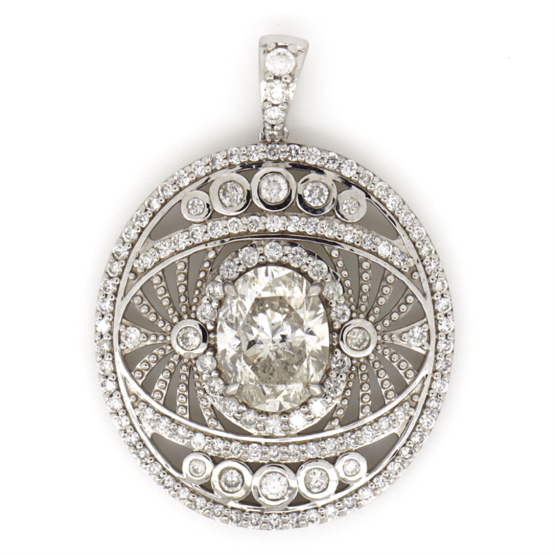 14K WHITE GOLD AND DIAMOND, DECORATIVE PENDANT. THE CENTRE FEATURES, ONE OVAL MIXED CUT, DIAMOND (2.02CT, J COLOUR, P2-P3 CLARITY), 4 CLAW SET. DECORATING THE CENTRE ARE, 124 ROUND BRILLIANT CUT, DIAMONDS (0.87C TDW, G-H COLOUR, SI1-SI2 CLARITY). MICROBEAD AND BEZEL SET. Valuations Provided by an Independent Third-Party Professional Not Directly Associated With Lloyds Auctions at AUD $56000This valuation has been conducted by an independent third-party professional. The valuation amount is an assessment by the issuing valuer and does not reflect the auction value of the item. Any inquiries regarding the valuation should be directed to the issuing valuer (refer to contact details on the certificate), as Lloyds Auctions has no affiliation or influence over the valuation, the valuer, or the stated amount. Condition: Good - Refer Images 0645857+5245