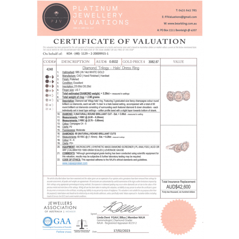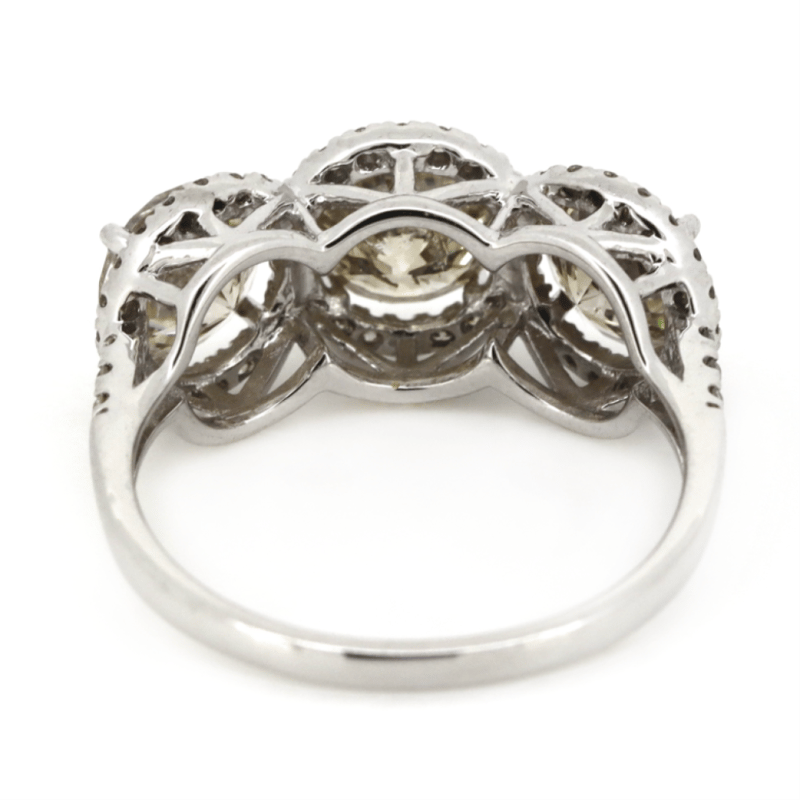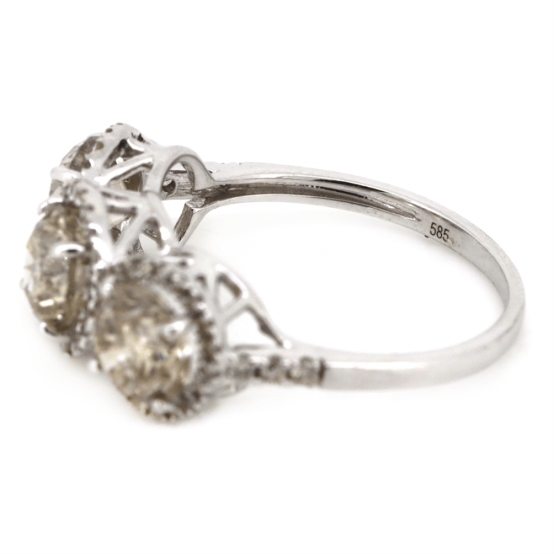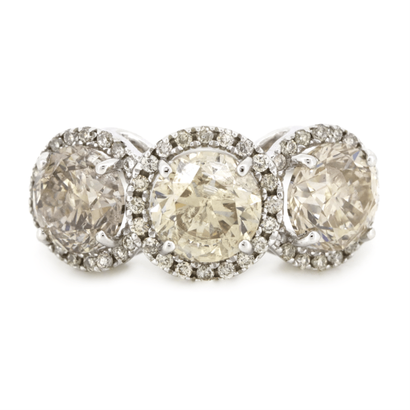 14K WHITE GOLD, CHAMPAGNE DIAMOND AND DIAMOND, HALO TRILOGY RING. THE CENTRE FEATURES, 3 ROUND BRILLIANT CUT, CHAMPAGNE, DIAMONDS (3.00CT TDW, C4-C5 COLOUR, P2 CLARITY), 4 CLAW SET. SURROUNDING THE DIAMONDS IN INDIVIDUAL HALOS AND DECORATING THE SHOULDERS ARE, 60 ROUND BRILLIANT CUT, DIAMONDS (0.29CT TDW, H-K COLOUR, P2+ CLARITY), BEAD SET. RING SIZE N 1/2.