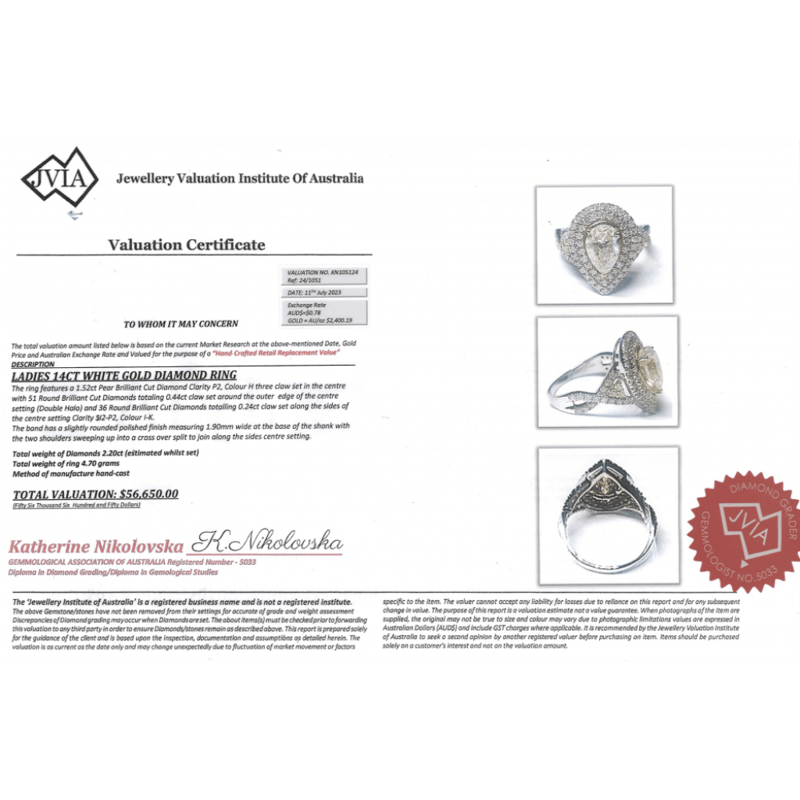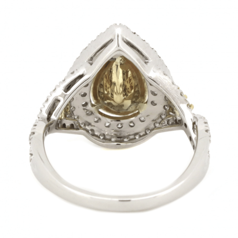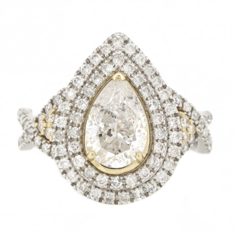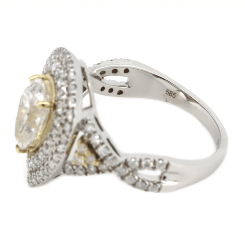 14K WHITE GOLD AND DIAMOND, DOUBLE HALO TWIST BAND RING. THE CENTRE FEATURES, ONE PEAR BRILLIANT CUT, DIAMOND (1.52CT TDW, H COLOUR, P2 CLARITY), 3 CLAW SET IN YELLOW GOLD. SURROUNDING THE CENTRE IN A DOUBLE HALO AND DECORATING THE TWIST BAND ARE, 87 ROUND BRILLIANT CUT, DIAMONDS (0.68CT TDW, I-K COLOUR, SI2-P2 CLARITY), CLAW SET. RING SIZE M 1/2.
