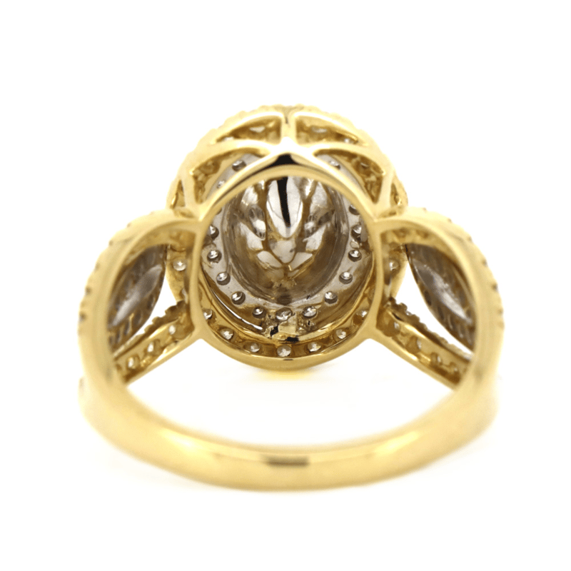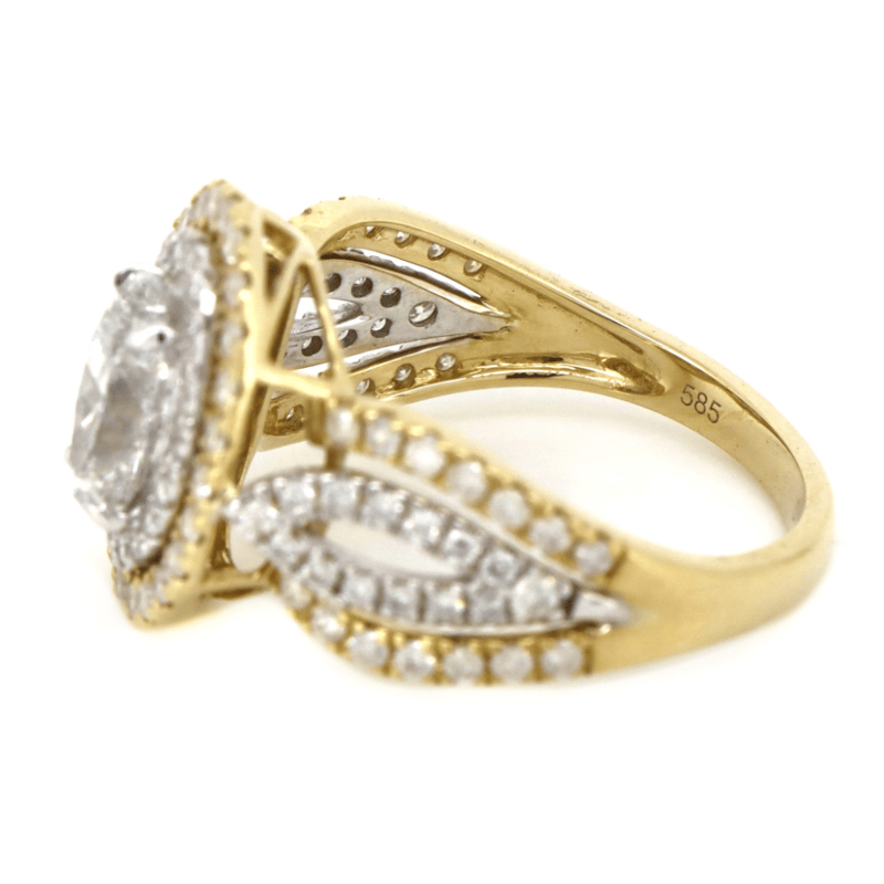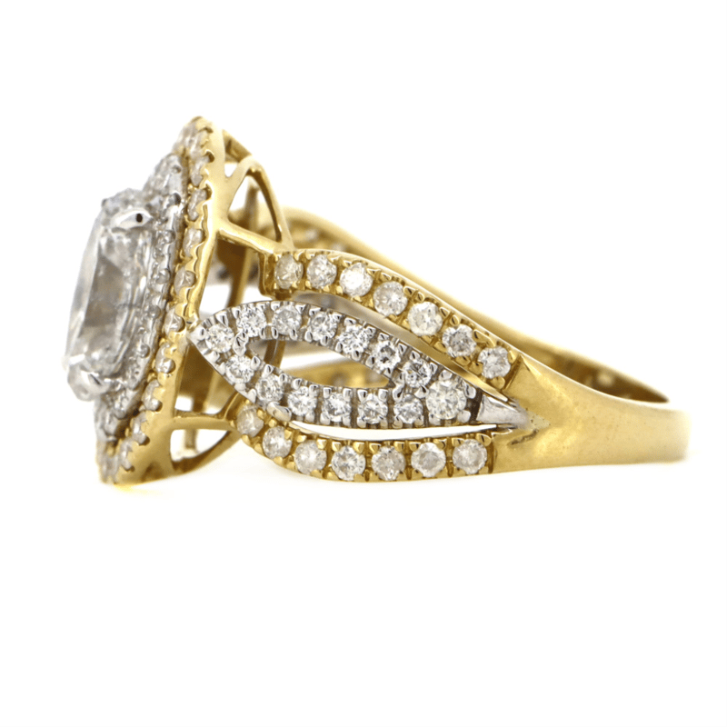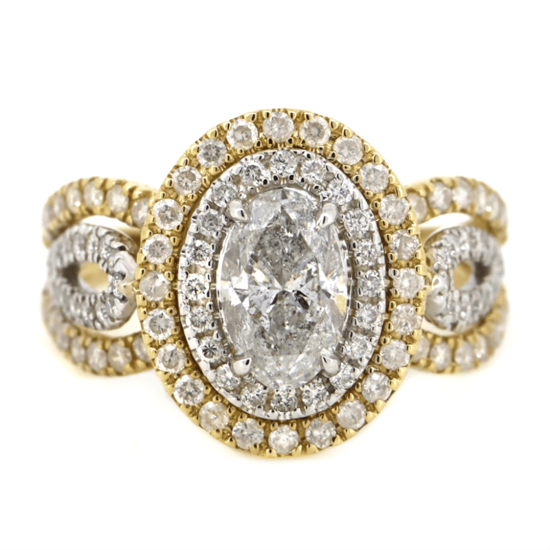 14K YELLOW/WHITE GOLD AND DIAMOND, DOUBLE HALO SPLIT BAND RING. THE CENTRE FEATURES, ONE OVAL CUT, DIAMOND (1.00CT, H-J COLOUR, P1-P2 CLARITY), 4 CLAW SET. SURROUNDING THE CENTRE IN A DOUBLE HALO AND DECORATING THE BAND ARE, 100 ROUND BRILLIANT CUT, DIAMONDS (0.76CT TDW, H-K COLOUR, SI1-SI2 CLARITY), MICRO-BEAD SET IN YELLOW/WHITE GOLD. RING SIZE L 1/2.
