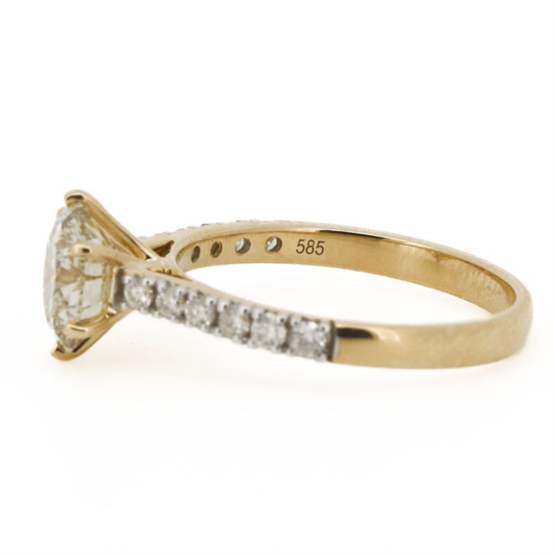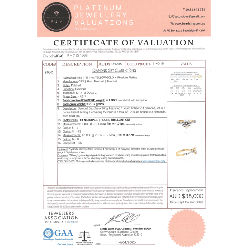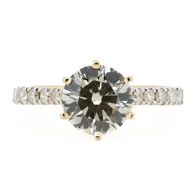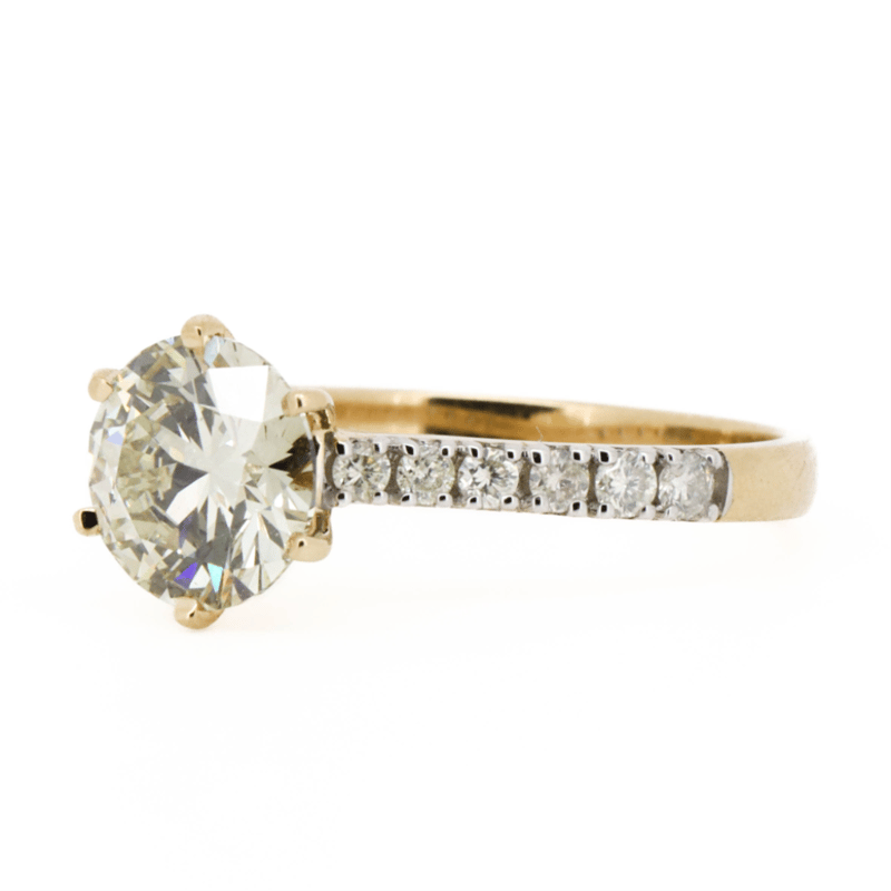 14K YELLOW GOLD AND DIAMOND, CLASSIC RING. THE CENTRE FEATURES, ONE ROUND BRILLIANT CUT, DIAMOND (1.71CT, K-L COLOUR, P1-P2 CLARITY), 6 CLAW SET. DECORATING THE BAND ARE, 12 ROUND BRILLIANT CUT, DIAMONDS (0.27CT TDW, G-H COLOUR, SI1-SI2 CLARITY), BEAD SET. RING SIZE N.