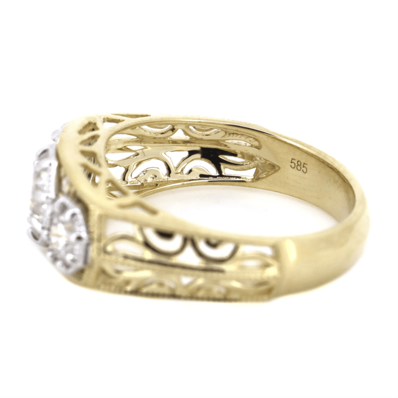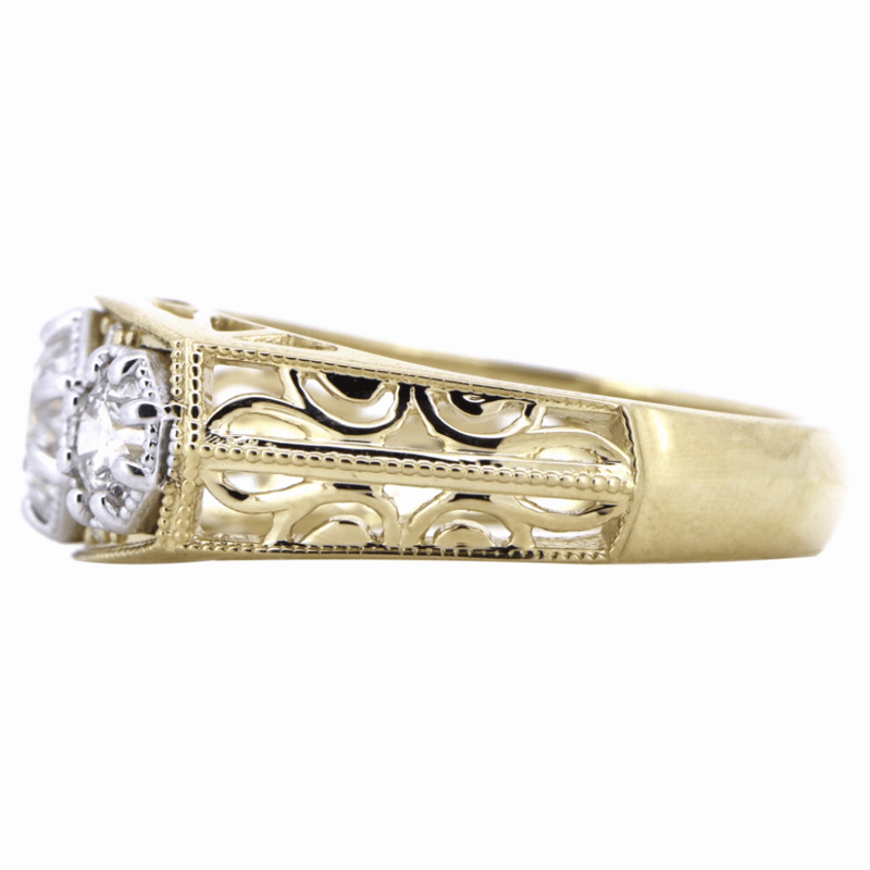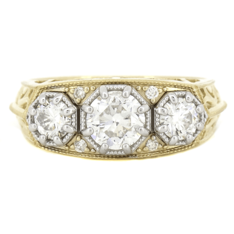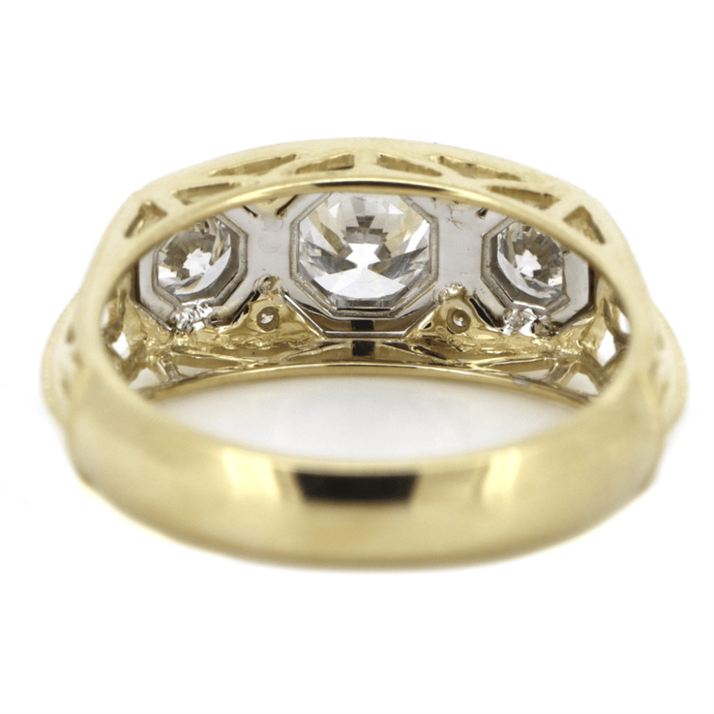 14K YELLOW/WHITE GOLD AND DIAMOND, TRILOGY RING. THE DESIGN CENTRALLY FEATURES, 3 ROUND BRILLIANT CUT, DIAMONDS (1.63CT TDW, H-I COLOUR, SI2-P1 CLARITY), MULTI-CLAW SET. DECORATING THE DESIGN ARE, 4 ROUND BRILLIANT CUT, DIAMONDS (0.04CT TDW, H-I COLOUR, SI2-P1 CLARITY), BEAD SET. RING SIZE O.