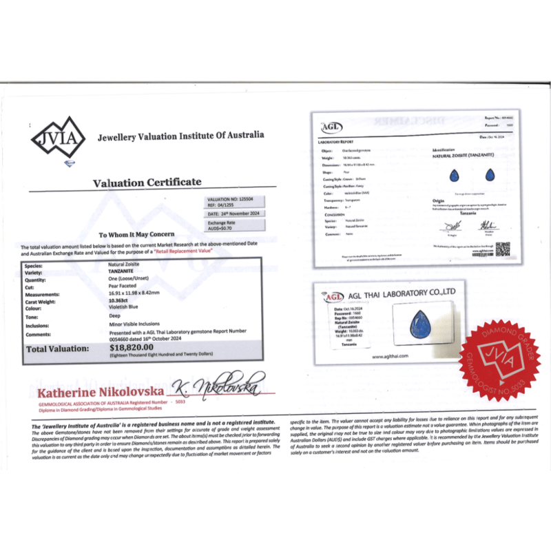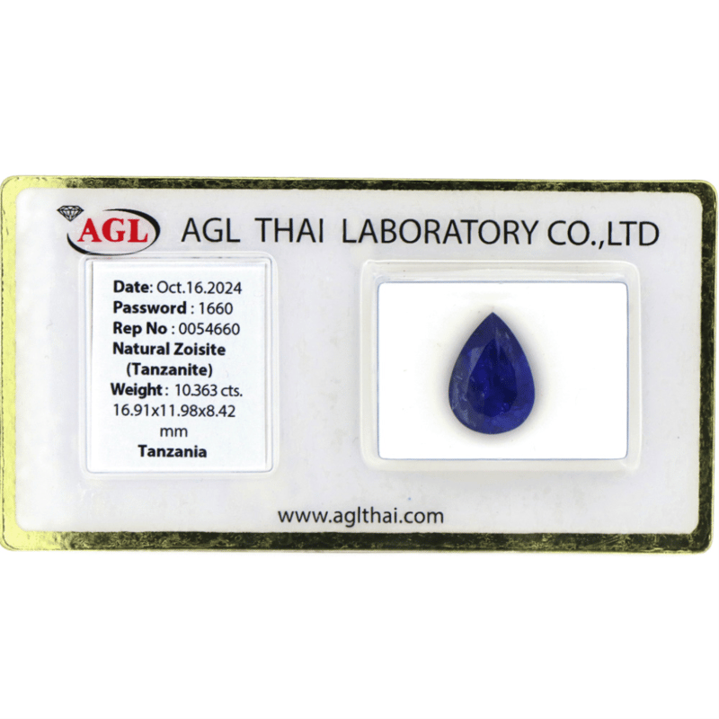 10.363CT CERTIFIED, NATURAL ZOISITE TANZANITE, PEAR FACETED CUT, DEEP VIOLETISH-BLUE, LOOSE, UNSET. STONE COMES SEALED WITH AGL REPORT: 0054660.