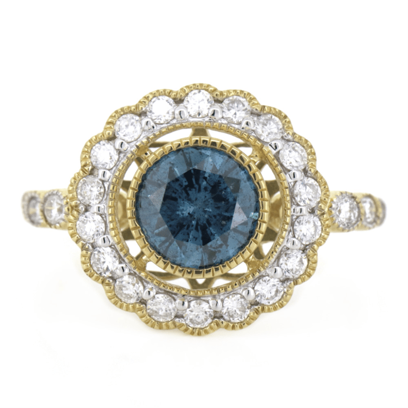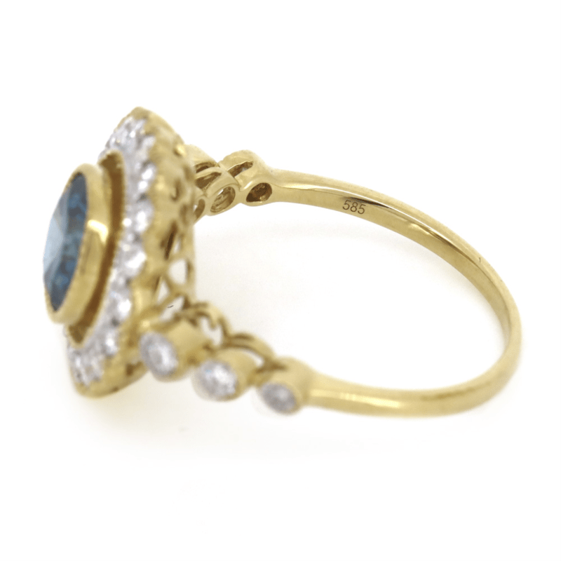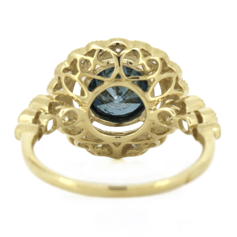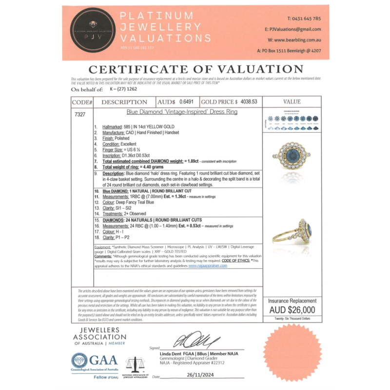 14K YELLOW GOLD, BLUE DIAMOND AND DIAMOND, VINTAGE INSPIRED RING. THE CENTRE FEATURES, ONE ROUND FACETED CUT, DEEP FANCY TEAL BLUE, DIAMOND (1.36CT, SI1-SI2 CLARITY, HEAT TREATMENTS OBSERVED), BEZEL SET. SURROUNDING THE CENTRE IN A HALO AND DECORATING THE BAND ARE, 24 ROUND BRILLIANT CUT, DIAMONDS (0.53CT TDW, H-I COLOUR, P1-P2 CLARITY), CLAW SET. RING SIZE M 1/2. Valuations Provided by an Independent Third-Party Professional Not Directly Associated With Lloyds Auctions at AUD $26000This valuation has been conducted by an independent third-party professional. The valuation amount is an assessment by the issuing valuer and does not reflect the auction value of the item. Any inquiries regarding the valuation should be directed to the issuing valuer (refer to contact details on the certificate), as Lloyds Auctions has no affiliation or influence over the valuation, the valuer, or the stated amount. Condition: Good - Refer Images 0645857+5299