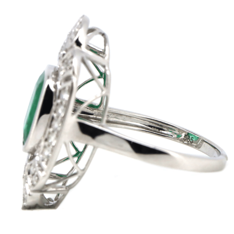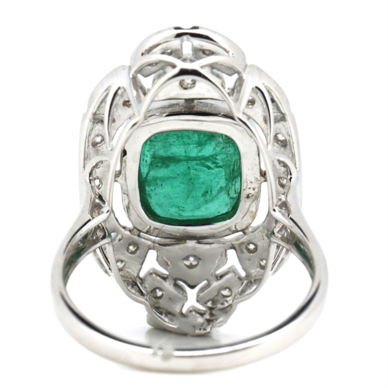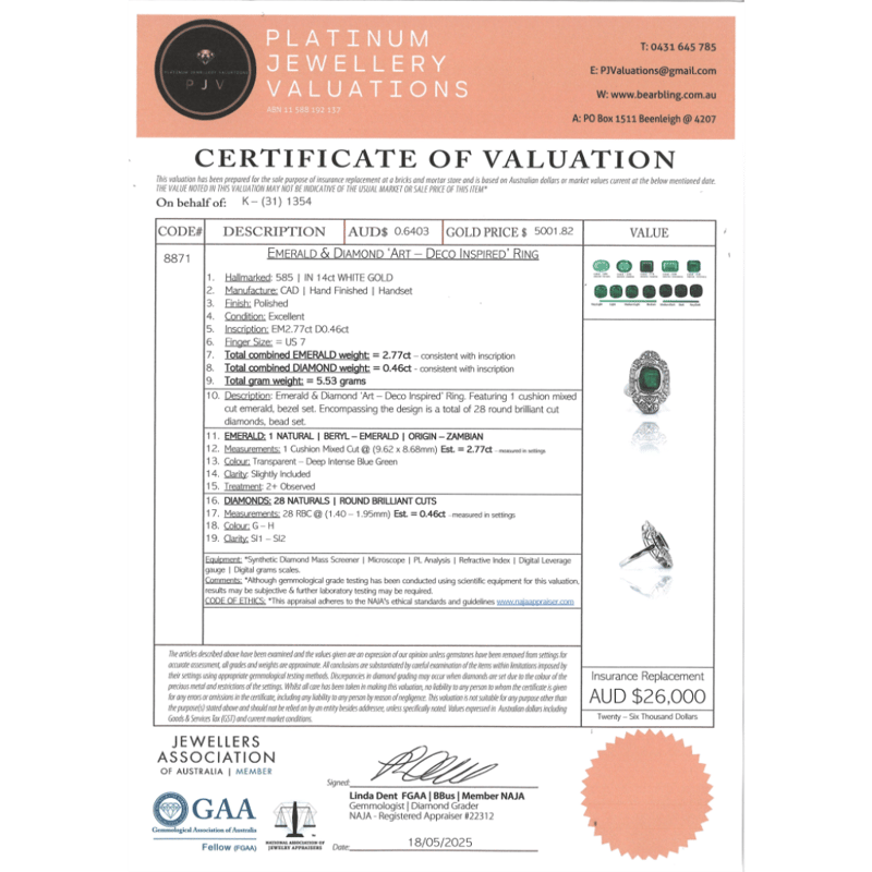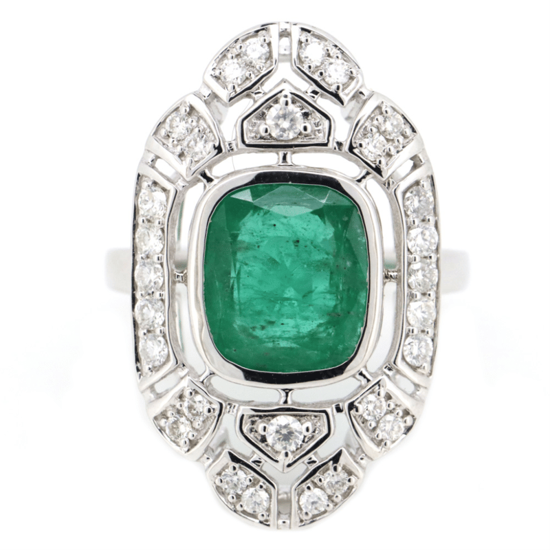 14K WHITE GOLD, EMERALD AND DIAMOND, ART DECO INSPIRED RING. THE CENTRE FEATURES, ONE CUSHION MIXED CUT, DEEP INTENSE BLUE GREEN, EMERALD (2.77CT, SLIGHTLY INCLUDED), BEZEL SET. ENCOMPASSING THE DESIGN ARE, 28 ROUND BRILLIANT CUT, DIAMONDS (0.46CT TDW, G-H COLOUR, SI1-SI2 CLARITY), BEAD SET IN WHITE GOLD. RING SIZE N.