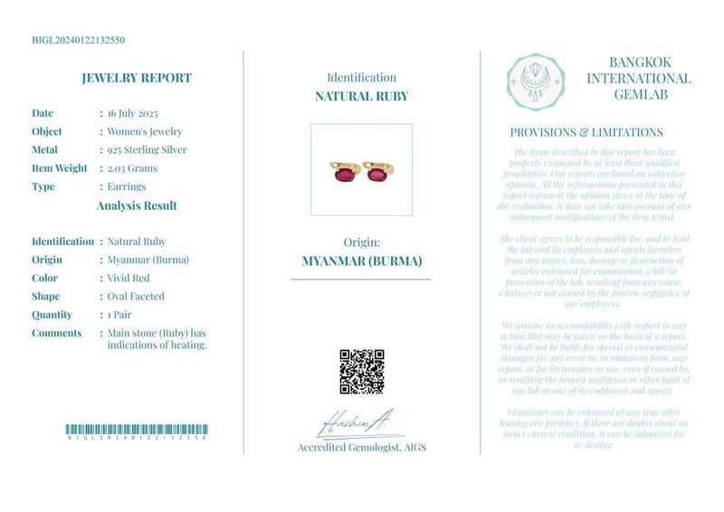 NATURAL BURMESE RUBY EARRINGS ON 925 SILVER - WITH DIGITAL CERTIFICATE ONLY Gemstone : Natural Burmese RubyCertificate (Digital): Bigl20240122132550Item Total Weight : 2.03 GramsMain Stone Color : Vivid RedSize : Comments : Main Stone (Ruby) Has Indications Of Heating.✻ Verify Report Online At Www.Bangkokinternationalgemlab.Co Condition: Good - Refer Images 0161136+6