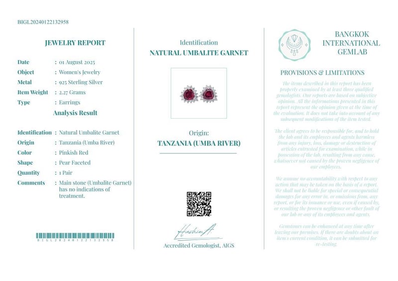 NATURAL UMBALITE GARNET (UNTREATED) EARRINGS ON 925 SILVER - WITH DIGITAL CERTIFICATE ONLY Gemstone : Natural Umbalite Garnet (Untreated)Certificate (Digital): Bigl20240122132958Item Total Weight : 2.27 GramsMain Stone Color : Pinkish RedSize : Comments : Main Stone (Umbalite Garnet) Has No Indications Of Treatment.✻ Verify Report Online At Www.Bangkokinternationalgemlab.Co Condition: Good - Refer Images 0161136+33