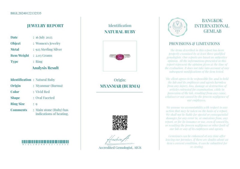 NATURAL BURMESE RUBY RING ON 925 SILVER - WITH DIGITAL CERTIFICATE ONLY Gemstone : Natural Burmese RubyCertificate (Digital): Bigl20240122132535Item Total Weight : 2.03 GramsMain Stone Color : Vivid RedSize : 9Comments : Main Stone (Ruby) Has Indications Of Heating.✻ Verify Report Online At Www.Bangkokinternationalgemlab.Co Condition: Good - Refer Images 0161136+5