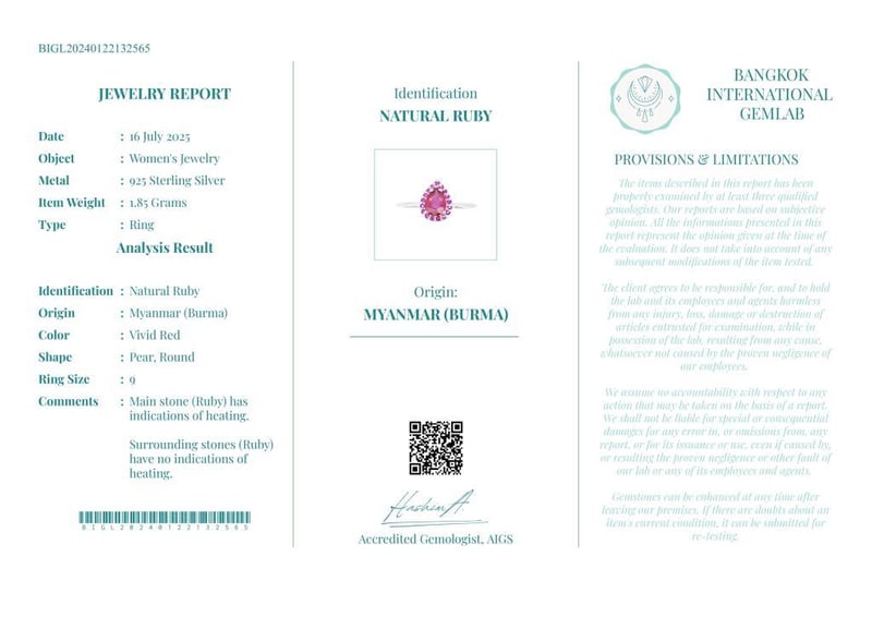 NATURAL BURMESE RUBY RING ON 925 SILVER - WITH DIGITAL CERTIFICATE ONLY Gemstone : Natural Burmese RubyCertificate (Digital): Bigl20240122132565Item Total Weight : 1.85 GramsMain Stone Color : Vivid RedSize : 9Comments : Main Stone (Ruby) Has Indications Of Heating. Surrounding Stones (Ruby) Have No Indications Of Heating.✻ Verify Report Online At Www.Bangkokinternationalgemlab.Co Condition: Good - Refer Images 0161136+7