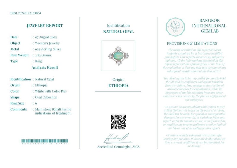 NATURAL OPAL RING ON 925 SILVER - WITH DIGITAL CERTIFICATE ONLY Gemstone : Natural OpalCertificate (Digital): Bigl20240122133064Item Total Weight : 2.83 GramsMain Stone Color : White With Color PlaySize : 6Comments : Main Stone (Opal) Has No Indications Of Treatment.✻ Verify Report Online At Www.Bangkokinternationalgemlab.Co Condition: Good - Refer Images 0161136+40