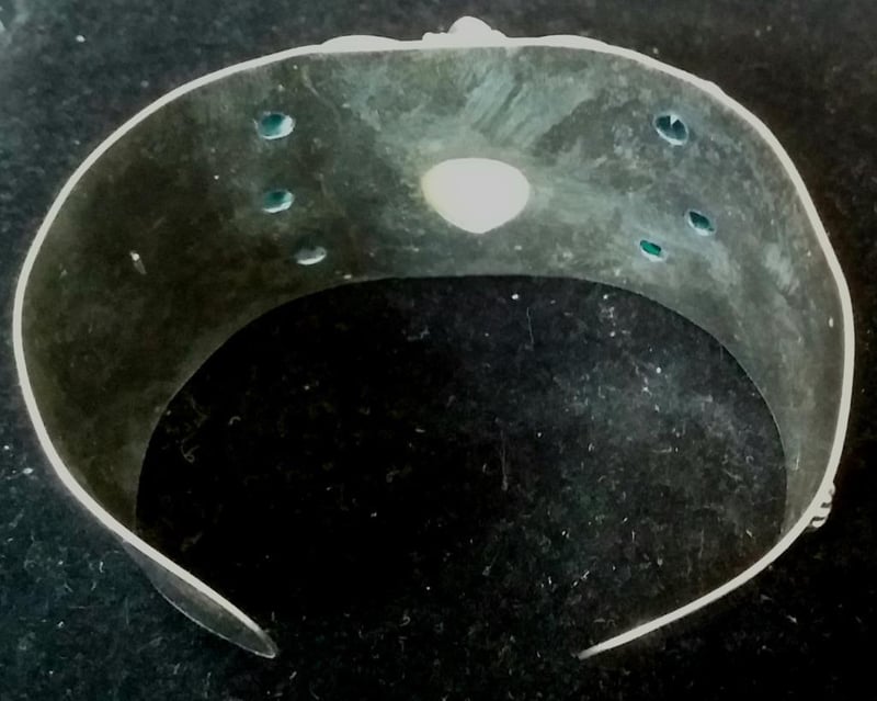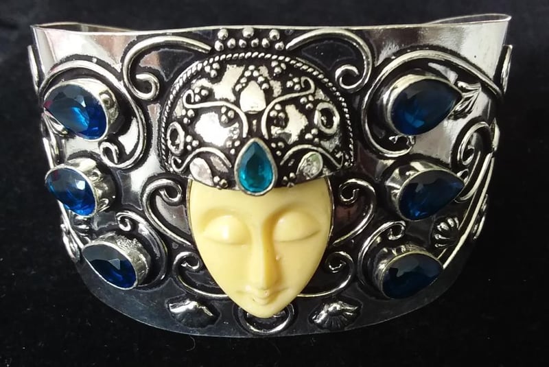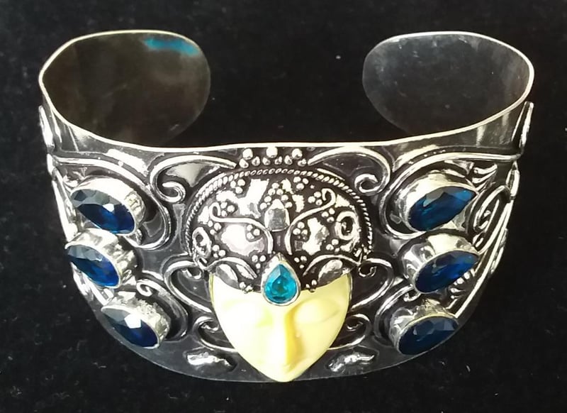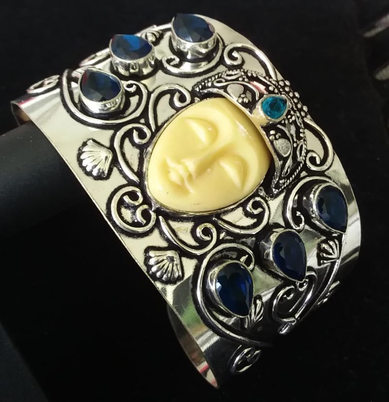 925 SILVER PLATED WIDE MOON FACE WITH GEMSTONES CUFF BRACELET Condition: Good - Refer Images 0162946+34FC