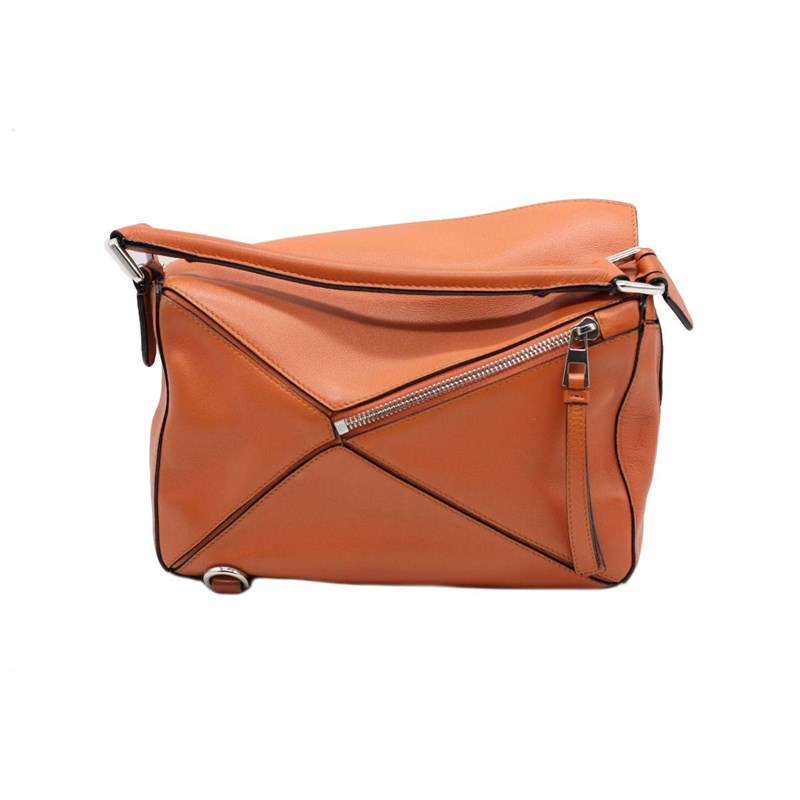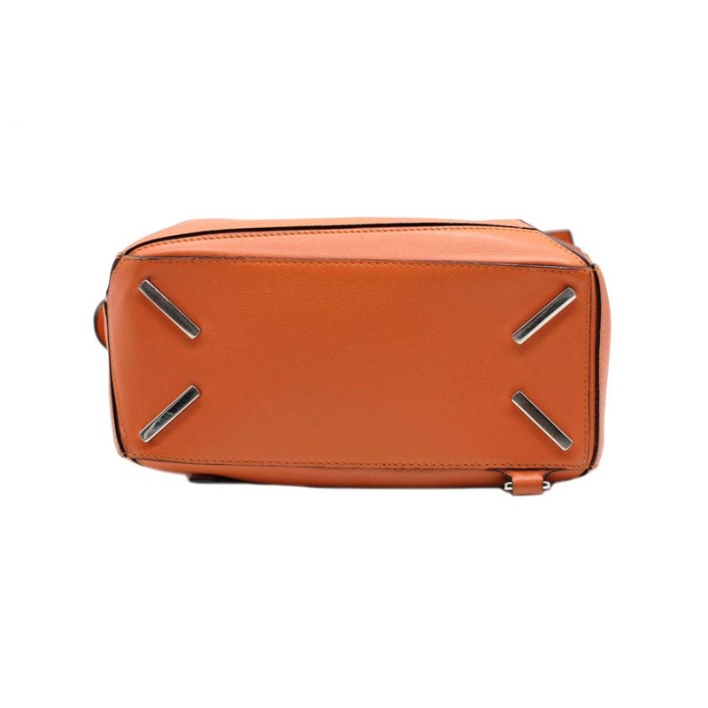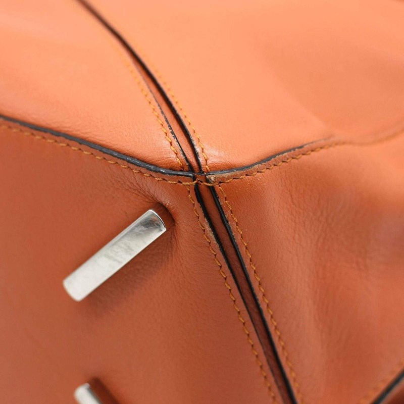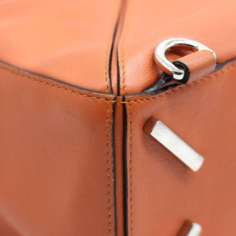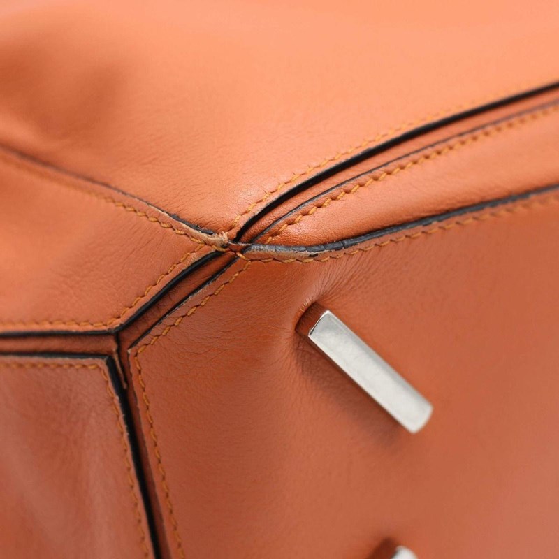 Leather with silver-tone hardware, single top handle, a rear zipped pocket, protective metal feet and a shoulder strap.