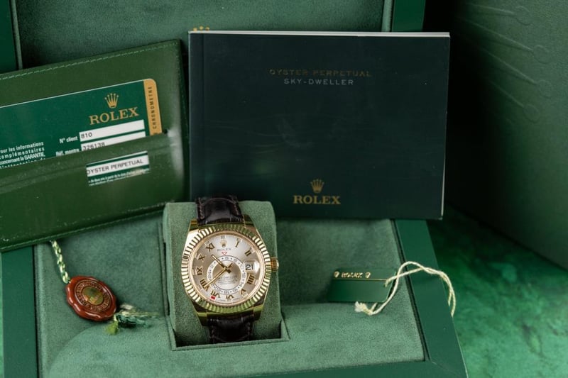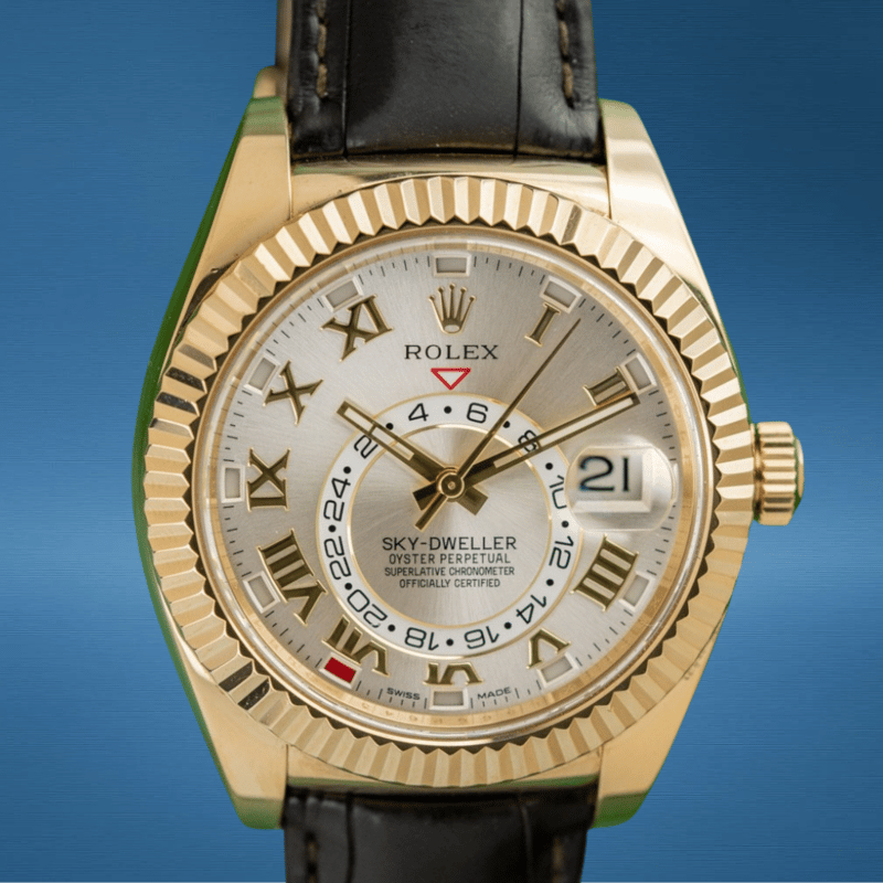 ROLEX SKY-DWELLER 326138 18K YELLOW GOLD SILVER DIAL LEATHER STRAP 2014