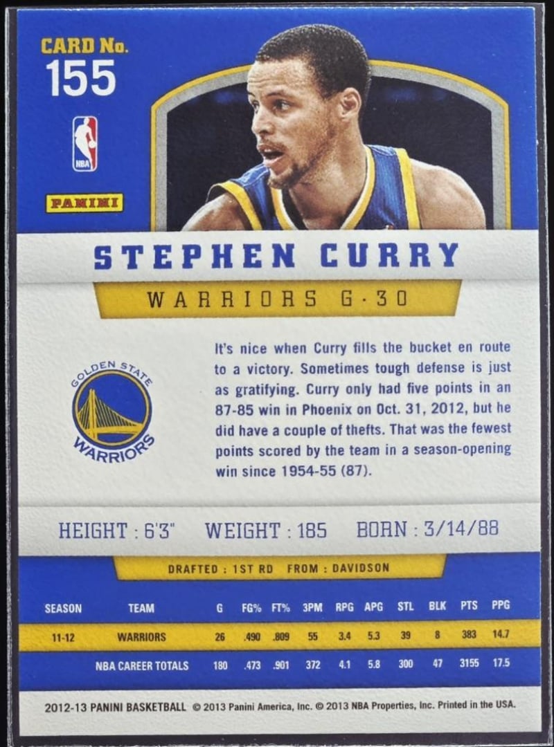 STEPHEN CURRY - 2012-13 PANINI BASKETBALL #155 STEPHEN CURRY - NBA BASKETBALL - GOLDEN STATE WARRIORS