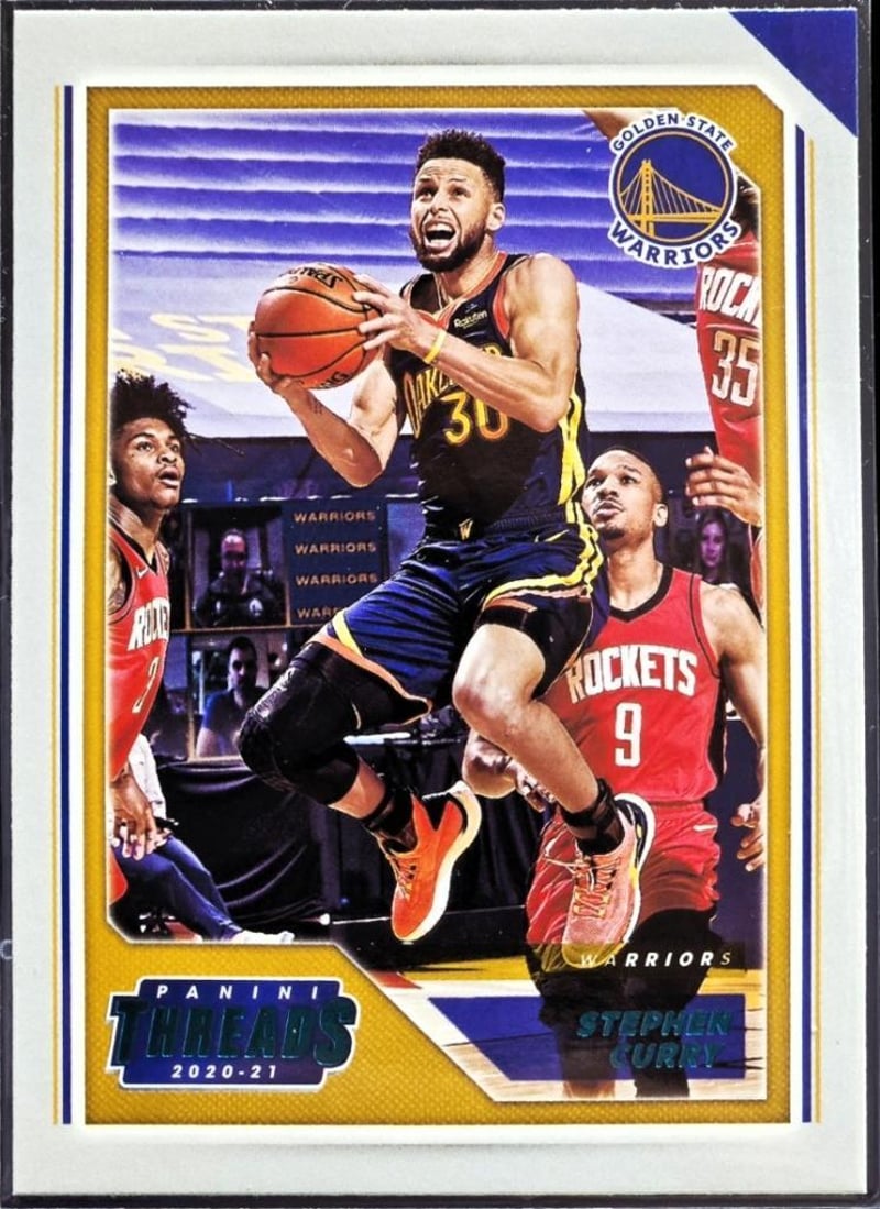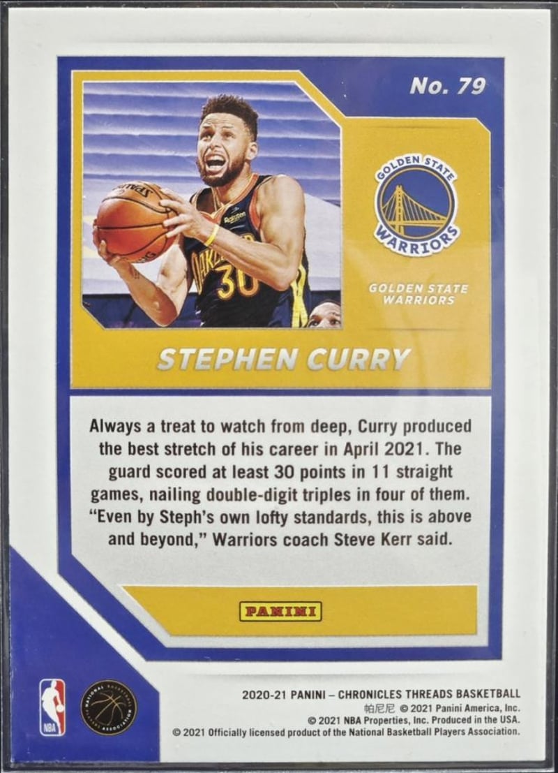 STEPHEN CURRY - 2020-21 PANINI CHRONICLES THREADS BASKETBALL #79 STEPHEN CURRY (TEAL) - NBA BASKETBALL - GOLDEN STATE WARRIORSThis Teal Variation From The 2020–21 Panini Chronicles Threads Set Features Stephen Curry In Action For The Golden State Warriors. The Teal Accenting Complements The Threads Design, Making It A Visually Appealing Modern Issue In Pristine Condition. The Card Preserved Immediately After Opening - Immediately Penny-Sleeved And Hard-Cased.This Card Has Undergone An Ai Pregrading Assessment. Refer To The Pregrading Assessment Report For Further Detail.584948+4