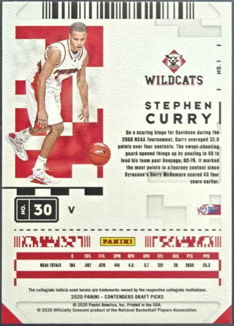 This Collegiate-Themed Card From The 2020 Panini Contenders Draft Picks Set Showcases Stephen Curry Representing Davidson Wildcats, Where His Storied Basketball Journey Began. The Card Is In Immaculate Condition, Encapsulated And Preserved Immediately After Opening - Immediately Penny-Sleeved And Hard-Cased.