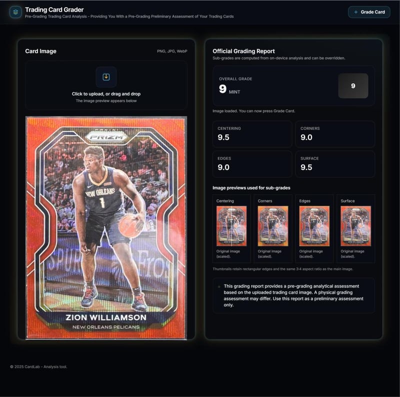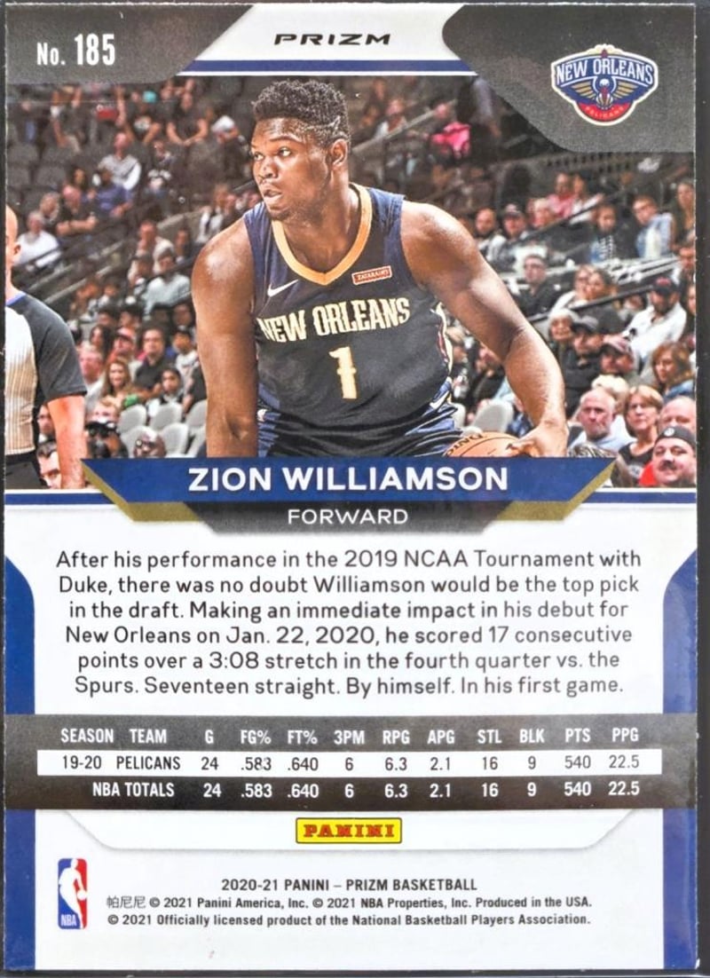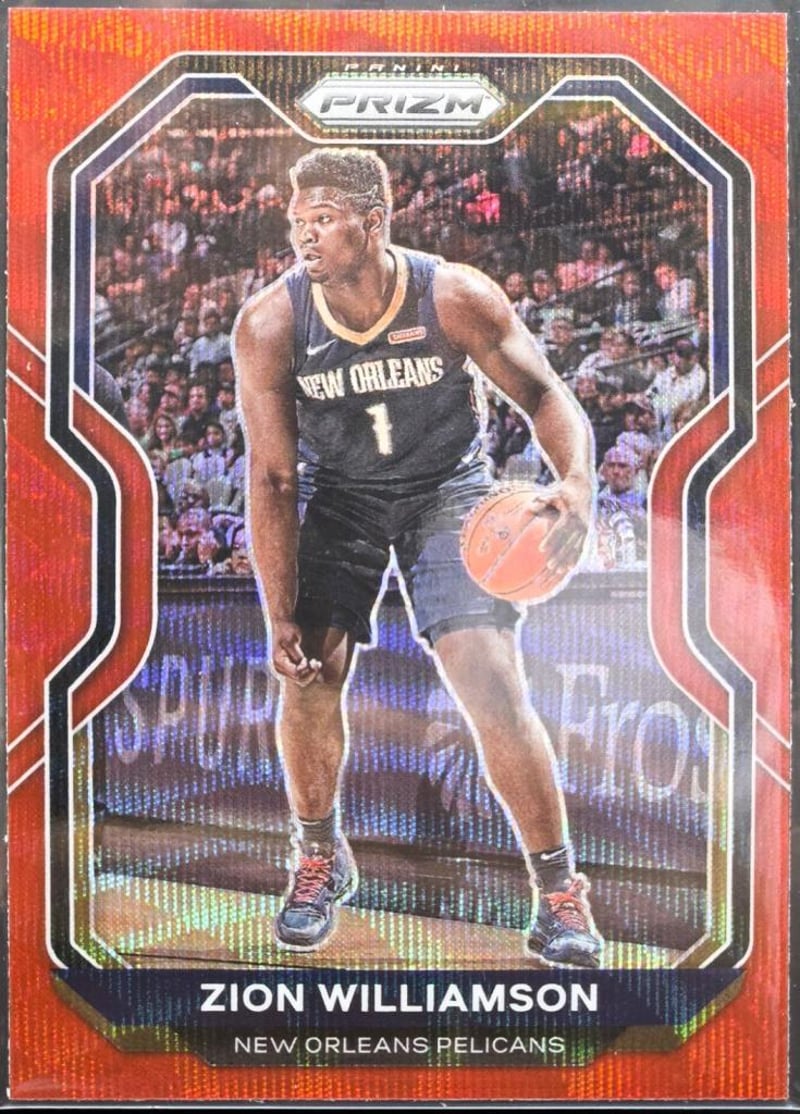 ZION WILLIAMSON - 2020-21 PANINI PRIZM BASKETBALL #185 ZION WILLIAMSON (RED WAVE PRIZM) - NBA BASKEBTALL - NEW ORLEANS PELICANSThis Red Wave Prizm Parallel Of Zion Williamson Captures The Explosive Forward In Striking Red Refractor Tones. From The 2020–21 Panini Prizm Set, It Remains In Phenomenal, Pack-Fresh Condition. Preserved Immediately After Opening - As With All Cards, Immediately Penny-Sleeved And Hard-Cased.This Card Has Undergone An Ai Pregrading Assessment. Refer To The Pregrading Assessment Report For Further Detail.584948+14