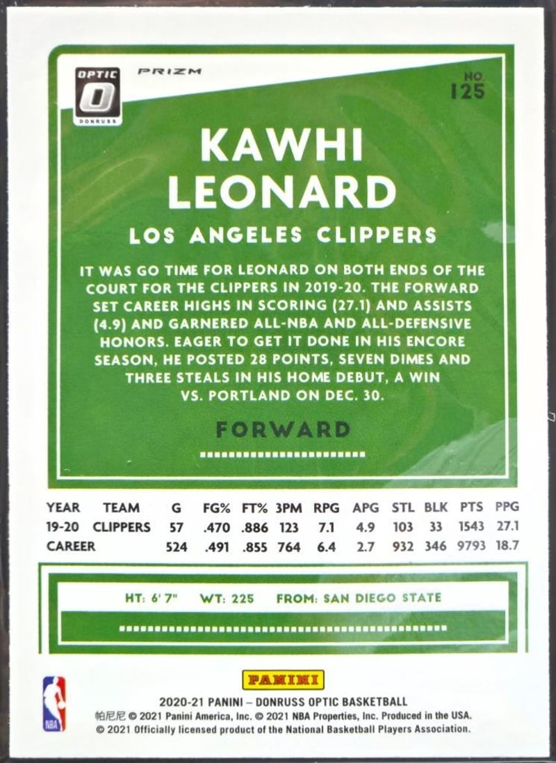 KAWHI LEONARD - 2020-21 DONRUSS OPTIC BASKETBALL #125 KAWHI LEONARD (SILVER PRIZM) - NBA BASKETBALL - LOS ANGELES CLIPPERSA Silver Prizm Variation From The 2020–21 Donruss Optic Collection, This Kawhi Leonard Card Showcases His Tenure With The Los Angeles Clippers. The Reflective Surface And Centring Are Pristine, And The Card Preserved Immediately After Opening - Immediately Penny-Sleeved And Hard-Cased.This Card Has Undergone An Ai Pregrading Assessment. Refer To The Pregrading Assessment Report For Further Detail.584948+15