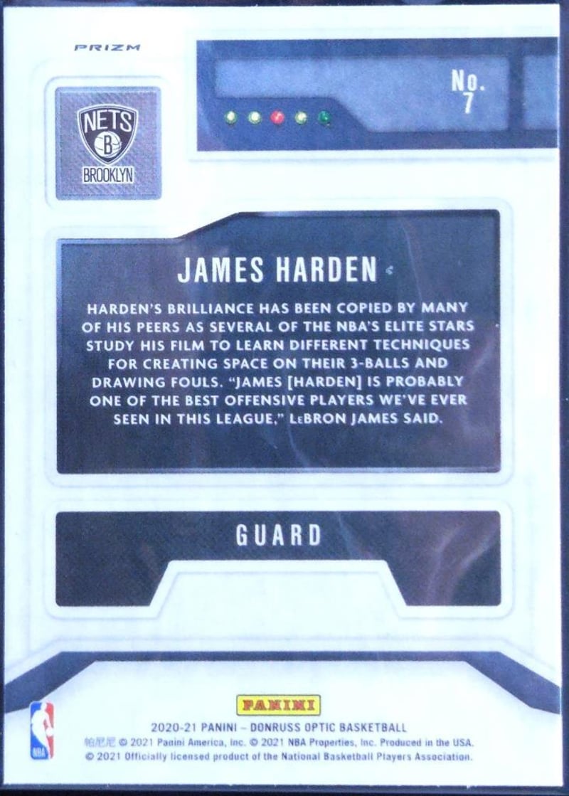 JAMES HARDEN - 2020-21 DONRUSS OPTIC BASKETBALL #7 JAMES HARDEN (T-MINUS PRIZM) - NBA BASKETBALL - BROOKLYN NETS