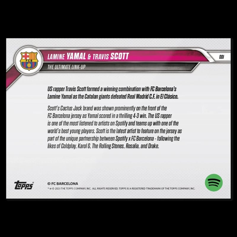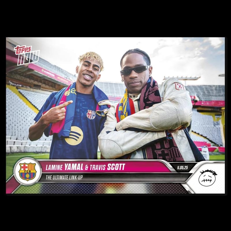TRAVIS SCOTT & LAMINE YAMAL - 2025 FC BARCELONA TOPPS NOW® - CARD 1 - PR: 22,483Travis Scott & Lamine Yamal - 2025 Fc Barcelona Topps Now® - Card 1 - Pr: 22,483Topps Now Celebrates The Greatest Moments... As They Happen!&Nbsp;Your Hero. Your Team. Your Moment.Condition: Good - Refer To Images488292+33431