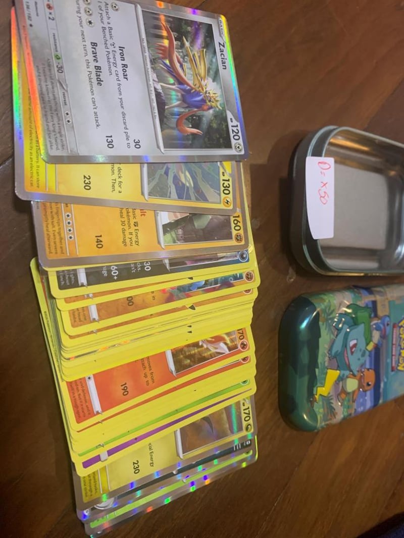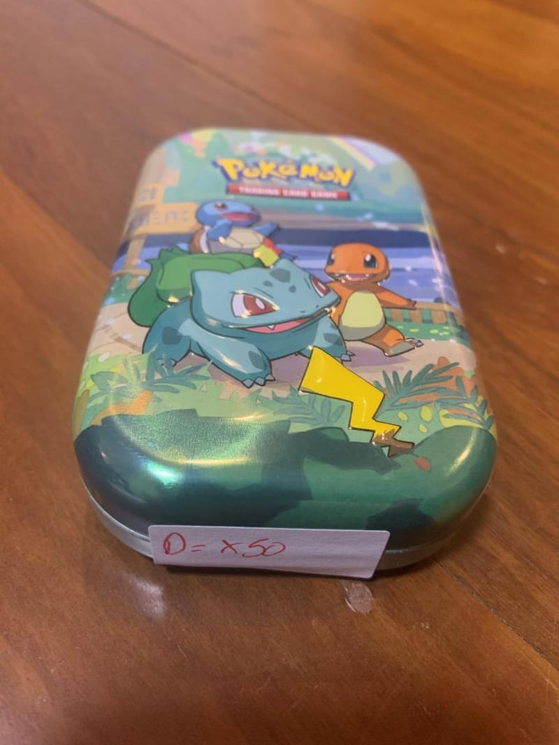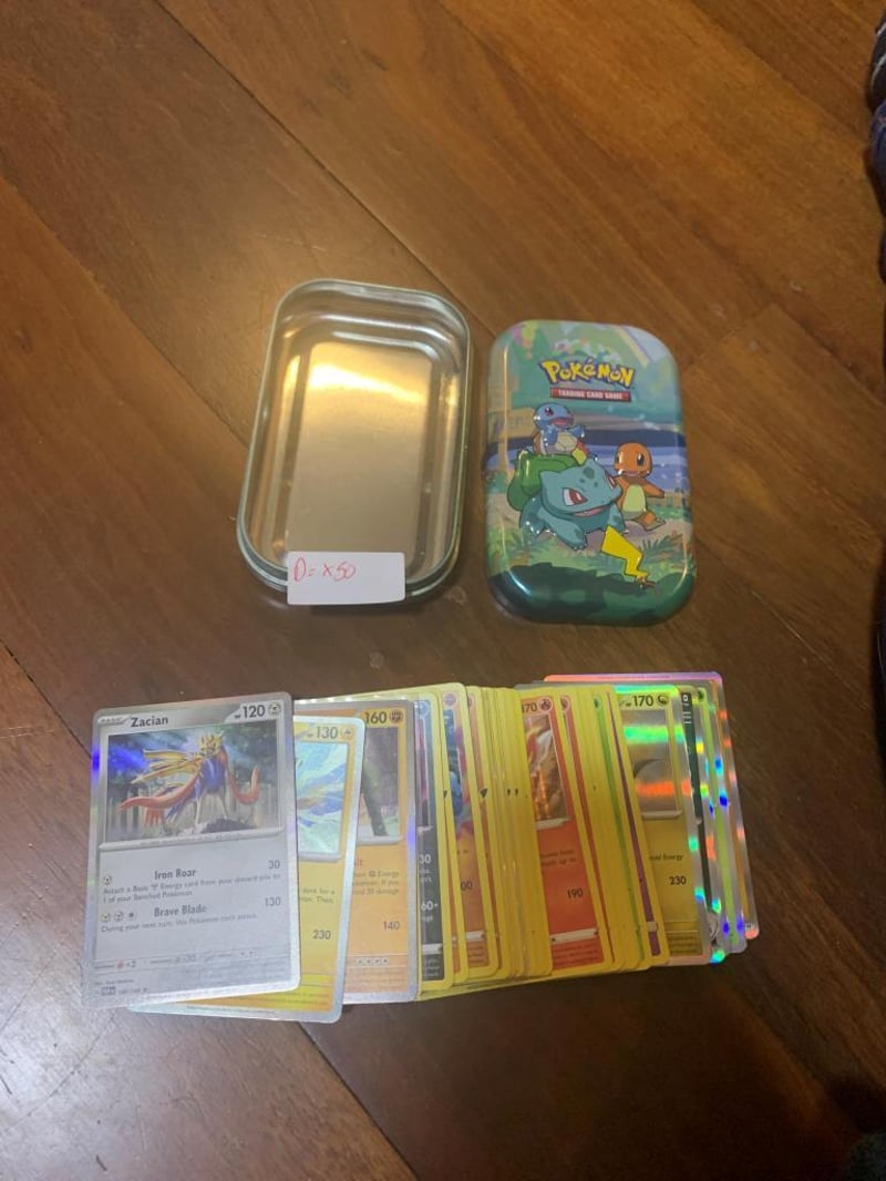 POKEMON COLLECTORS TIN + 50 CARDS (HALO/REVERSE HOLO/COMMONS)
