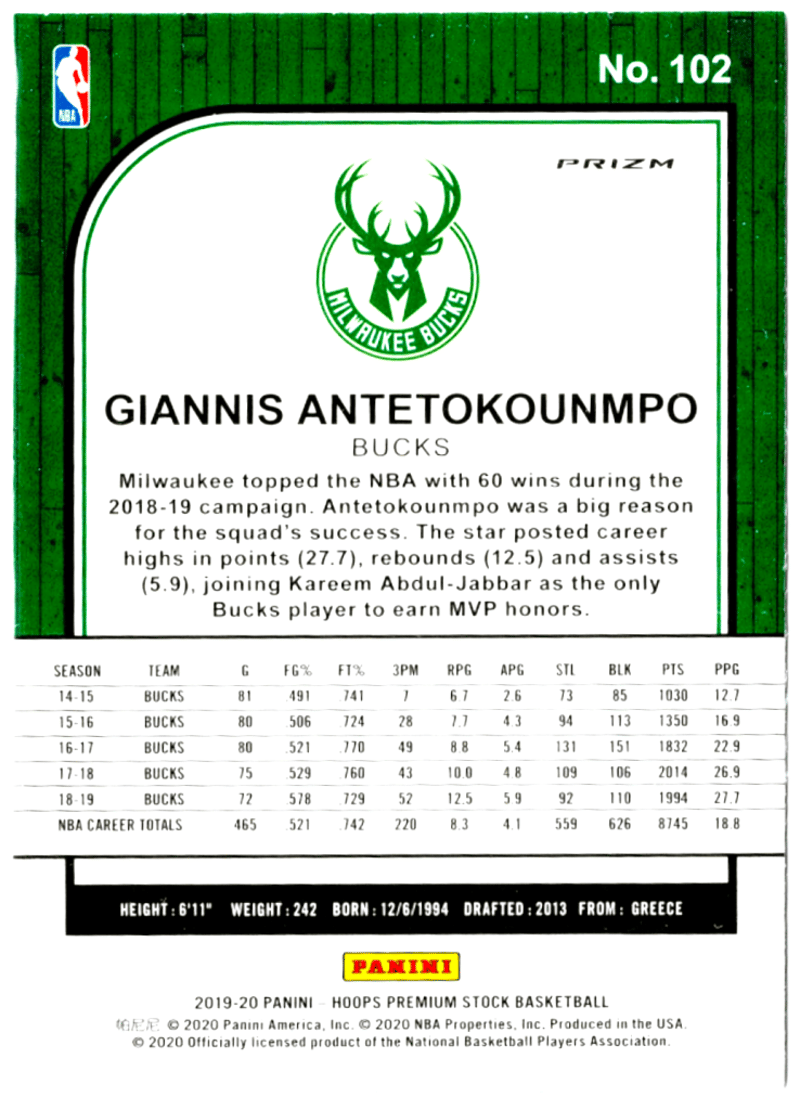 GIANNIS ANTETOKOUNMPO 2019-20 PANINI HOOPS PREMIUM STOCK #102 PULSAR PRIZM (MILWAUKEE BUCKS / GREECE)
