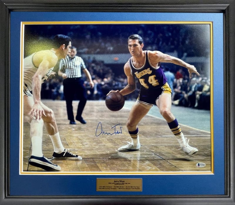 JERRY WEST "LOGO MAN" HAND SIGNED LAKERS PHOTO 16X20 FRAMED