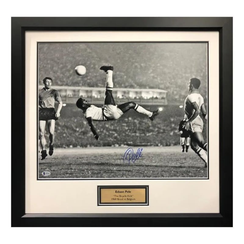 EDSON PELE SIGNED "BICYCLE KICK" 1968 BRAZIL VS BELGIUM FRAMED PHOTO – BECKETT AUTHENTICATEDCelebrate The Brilliance Of Edson Arantes Do Nascimento, Better Known As Pelé, With This Stunning Signed Display. The Black And White Photograph Captures The Brazilian Legend Performing His Iconic Bicycle Kick During The 1968 Brazil Vs Belgium Match — One Of The Most Famous Images In Football History.Pelé’S Bold Blue Signature Stands Out Beautifully Against The Monochrome Bacround, Making This A True Centerpiece For Any Sports Memorabilia Collection.Professionally Framed And Matted, The Piece Includes A Descriptive Nameplate And Comes With Beckett Authentication For Guaranteed Authenticity. A Timeless Tribute To The Man Widely Regarded As The Greatest Footballer Of All Time, This Signed Photograph Is A Must-Have For Serious Collectors And Fans Of The Beautiful Game.Condition: Good - Refer To Images488292+334145