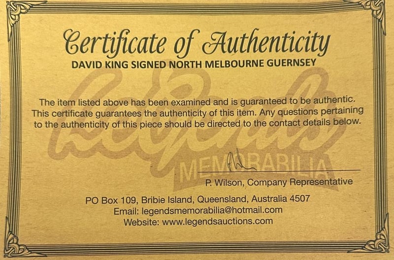 David King Personally Signed North Melbourne Guernsey. David King Is A Former Australian Rules Footballer Who Played For The North Melbourne Football Club In The Afl. The Item Is Accompanied By A Certificate Of Authenticity.