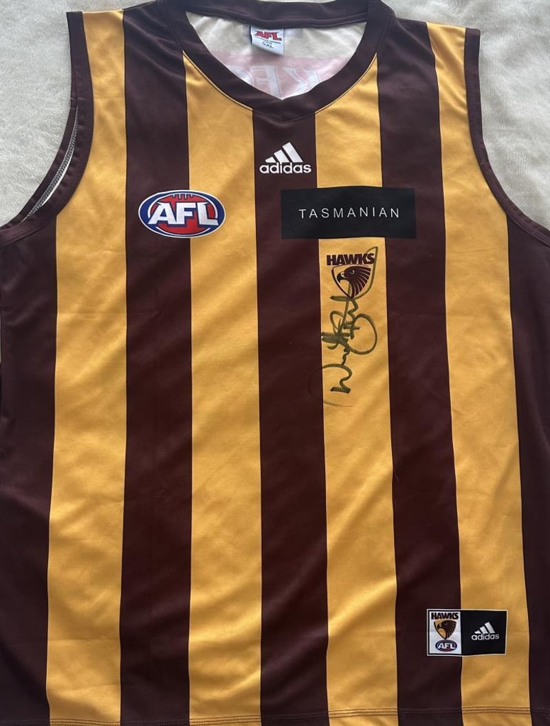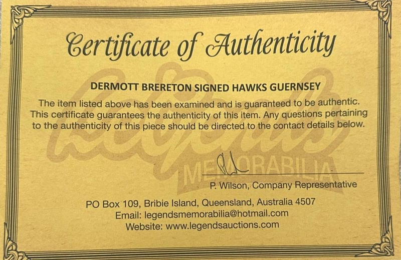 Dermott Brereton Personally Signed Hawks Guernsey. Dermott Brereton Is A Former Australian Rules Footballer Who Played For The Hawthorn Football Club, Sydney Swans And Collingwood Football Club In The Afl. The Item Is Accompanied By A Certificate Of Authenticity.