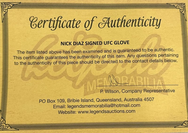 Nick Diaz Personally Signed Ufc Glove. Nicholas Diaz Is An American Professional Boxer And Mixed Martial Artist Who Competes In The Welterweight And Middleweight Divisions Of The Ultimate Fighting Championship. The Item Is Accompanied By A Certificate Of Authenticity.