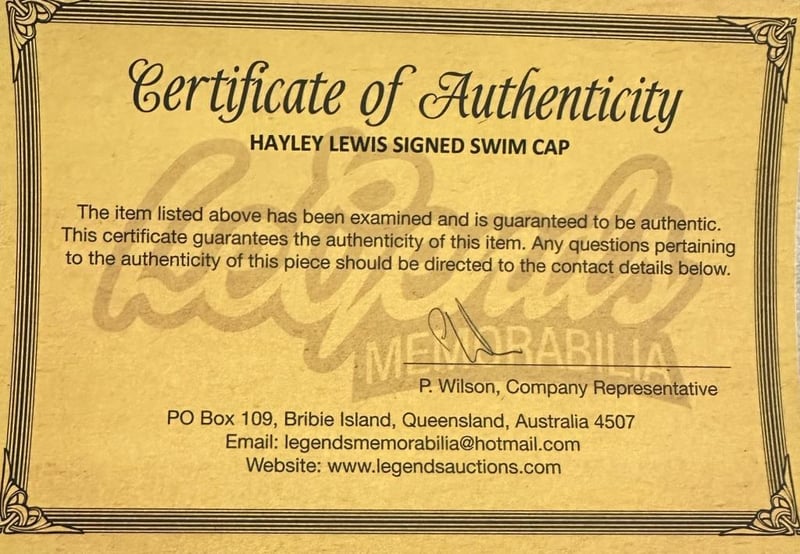 Hayley Lewis Personally Signed Swim Cap. Hayley Lewis Is An Australian Former Competitive Swimmer Best Known For Winning Five Gold Medals And One Bronze Medal At The 1990 Commonwealth Games At The Age Of 15. The Item Is Accompanied By A Certificate Of Authenticity.