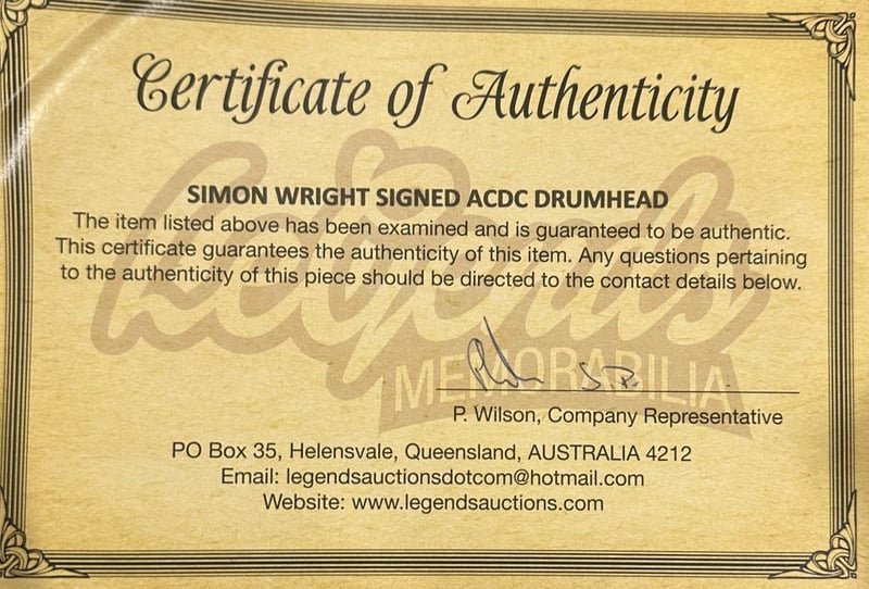 Simon Wright Personally Signed Acdc Drumhead. Simon Wright Is An English Drummer Best Known For His Work With Rock Bands Ac/Dc And Dio. The Item Is Accompanied By A Certificate Of Authenticity.