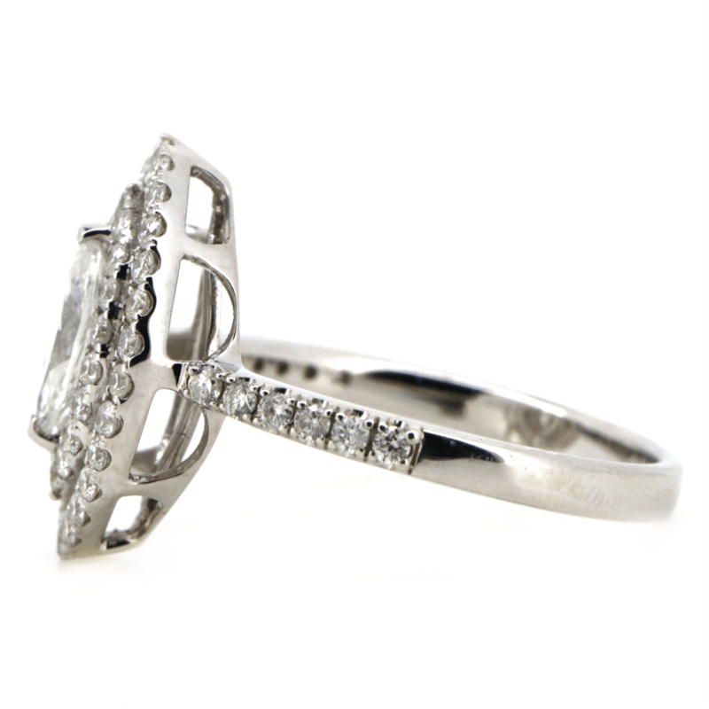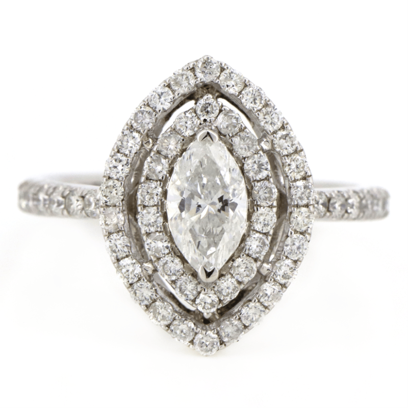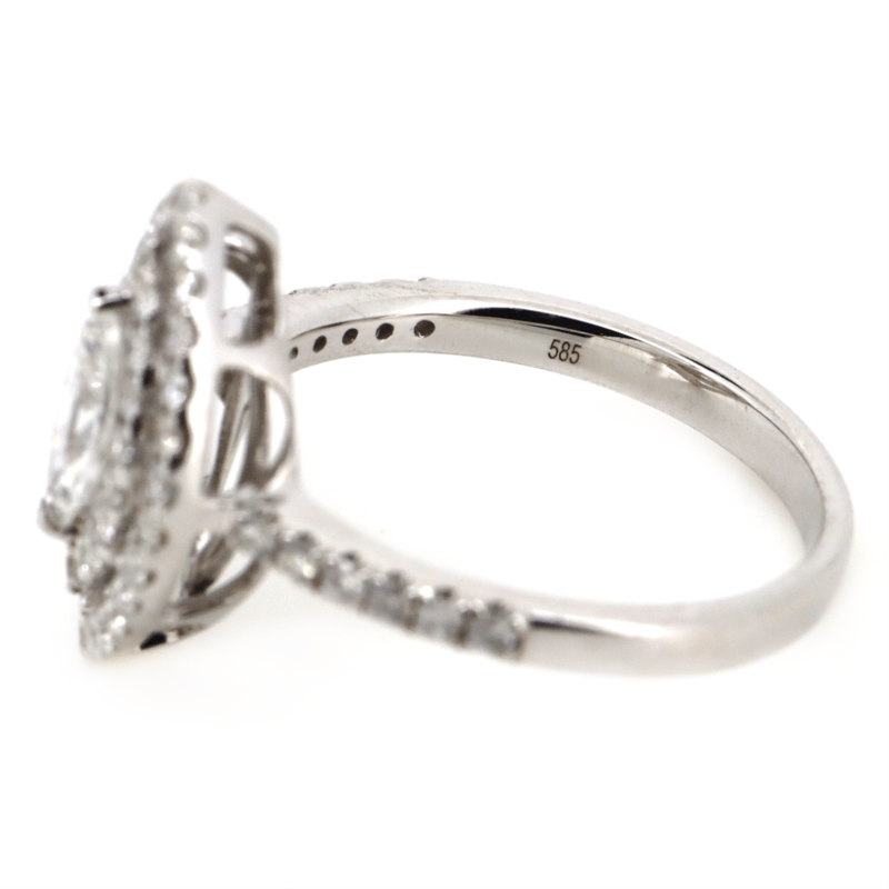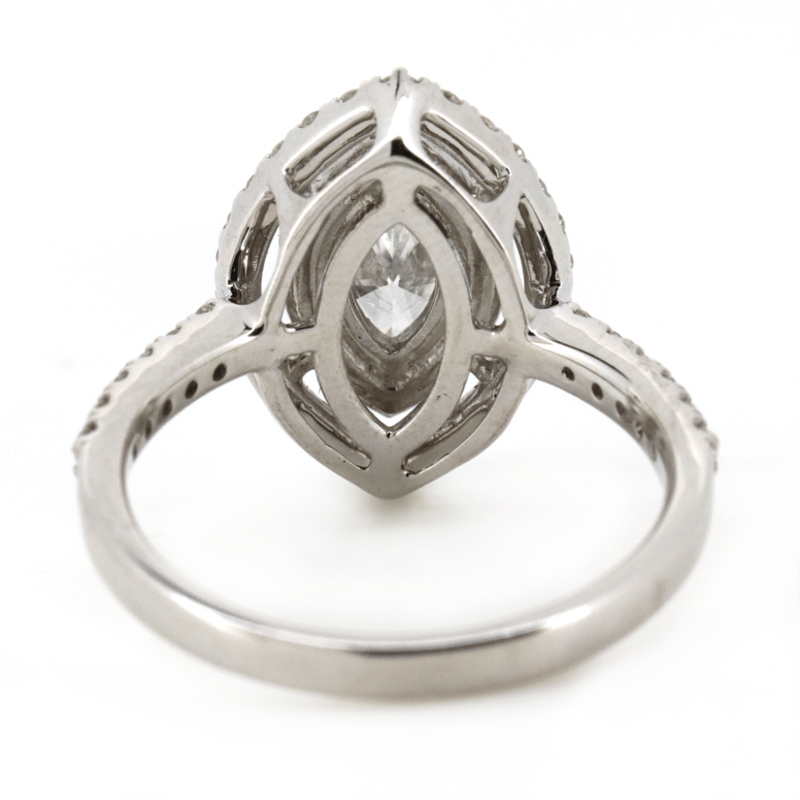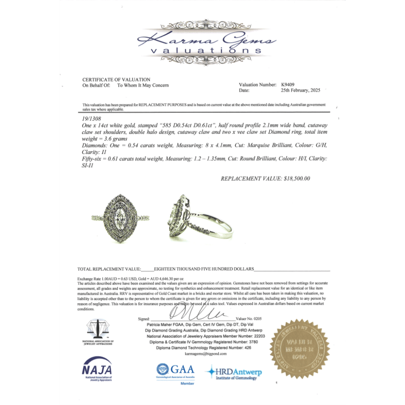 14K WHITE GOLD AND DIAMOND, DOUBLE HALO RING. THE CENTRE FEATURES, ONE MARQUISE CUT, DIAMOND (0.54CT, G-H COLOUR, I1 CLARITY), CLAW SET. SURROUNDING THE CENTRE IN A DOUBLE HALO AND DECORATING THE BAND ARE, 56 ROUND BRILLIANT CUT, DIAMONDS (0.61CT TDW, H-I COLOUR, SI-I1 CLARITY), CLAW SET. RING SIZE N. Valuations Provided by an Independent Third-Party Professional Not Directly Associated With Lloyds Auctions at AUD $18500This valuation has been conducted by an independent third-party professional. The valuation amount is an assessment by the issuing valuer and does not reflect the auction value of the item. Any inquiries regarding the valuation should be directed to the issuing valuer (refer to contact details on the certificate), as Lloyds Auctions has no affiliation or influence over the valuation, the valuer, or the stated amount. Condition: Good - Refer Images 0645863+5039