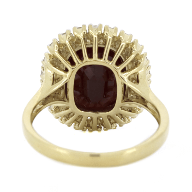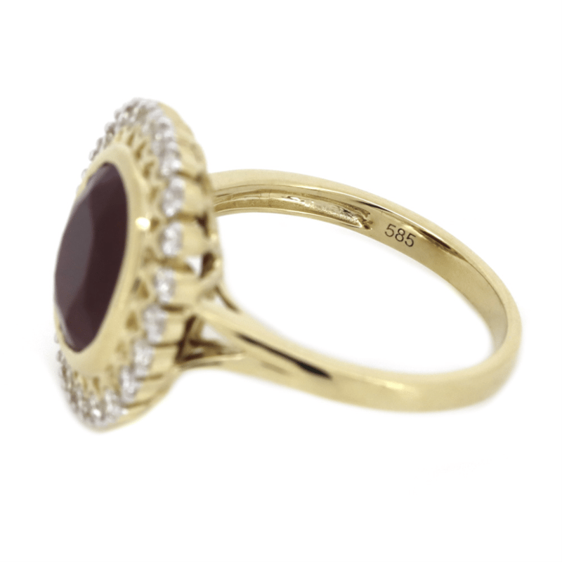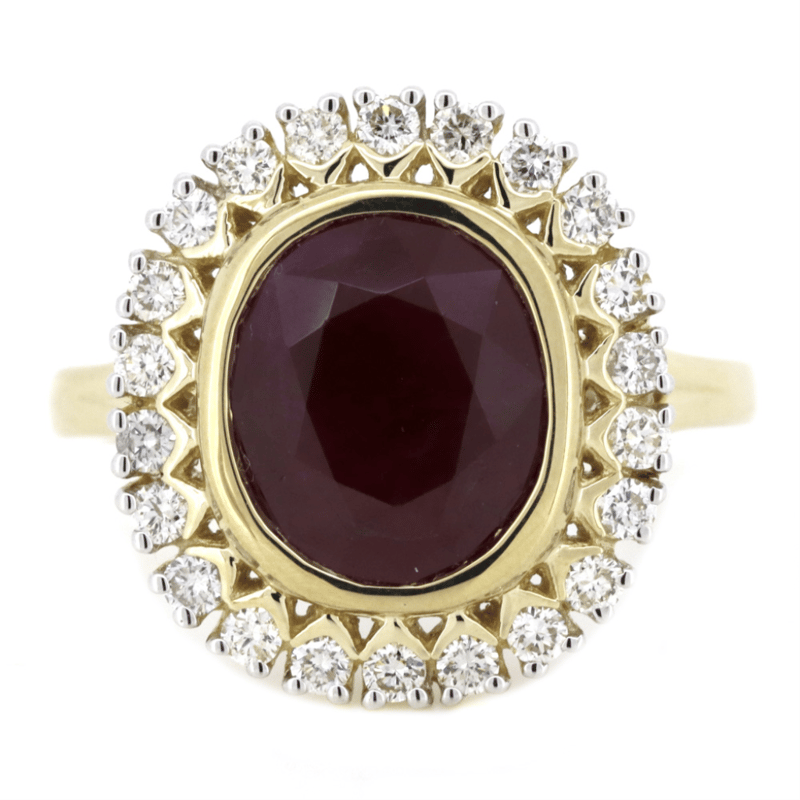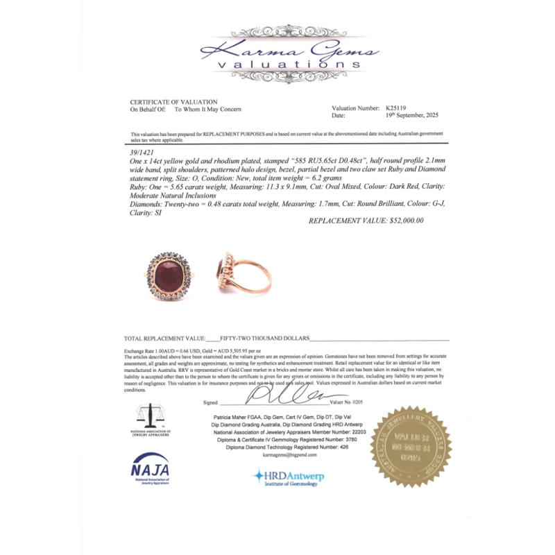 14K YELLOW GOLD, RUBY AND DIAMOND, HALO RING. THE CENTRE FEATURES, ONE OVAL CUT, DARK RED, RUBY (5.65CT, MODERATELY INCLUDED), BEZEL SET. SURROUNDING THE CENTRE IN A HALO ARE, 22 ROUND BRILLIANT CUT, DIAMONDS (0.48CT TDW, G-J COLOUR, SI CLARITY), CLAW SET IN YELLOW GOLD. RING SIZE O. Valuations Provided by an Independent Third-Party Professional Not Directly Associated With Lloyds Auctions at AUD $52000This valuation has been conducted by an independent third-party professional. The valuation amount is an assessment by the issuing valuer and does not reflect the auction value of the item. Any inquiries regarding the valuation should be directed to the issuing valuer (refer to contact details on the certificate), as Lloyds Auctions has no affiliation or influence over the valuation, the valuer, or the stated amount. Condition: Good - Refer Images 0645863+5009