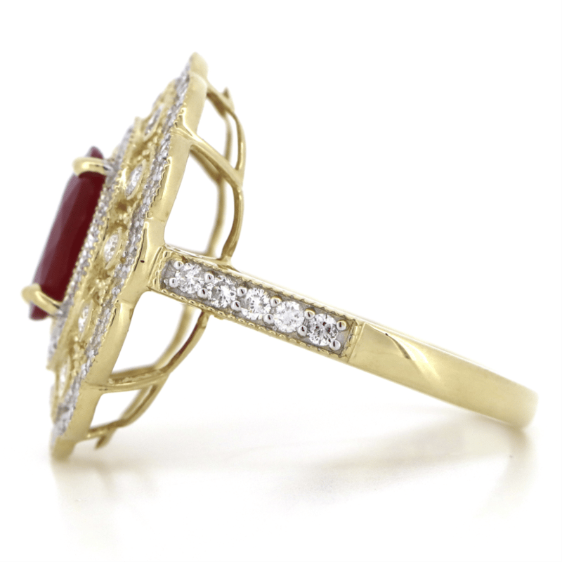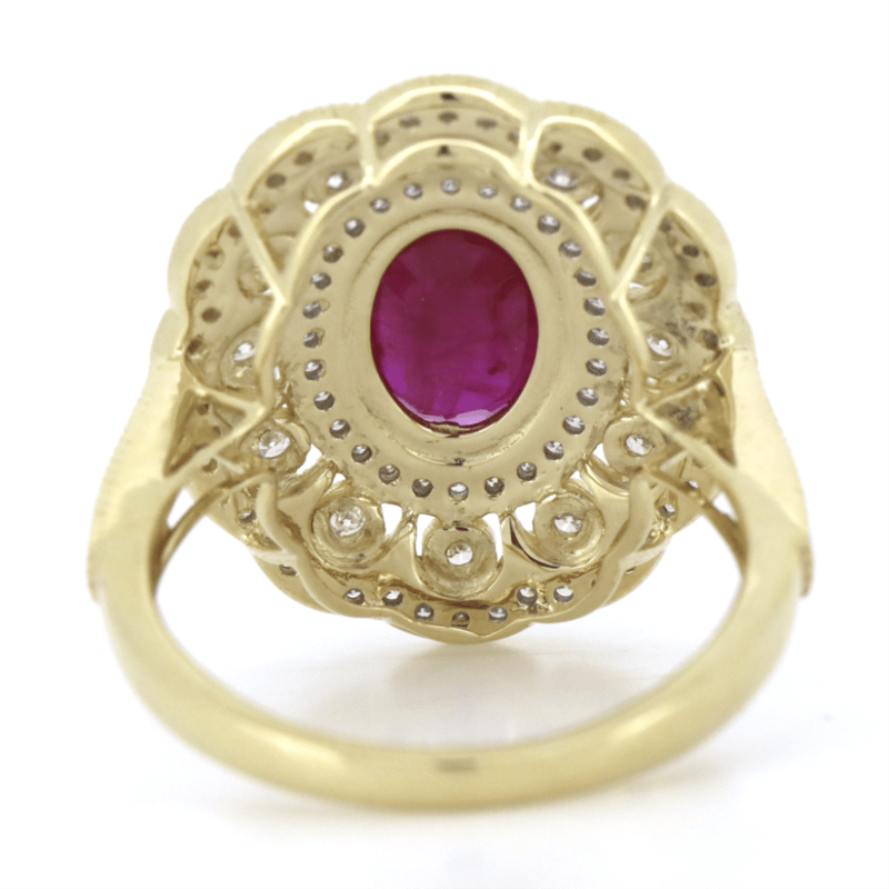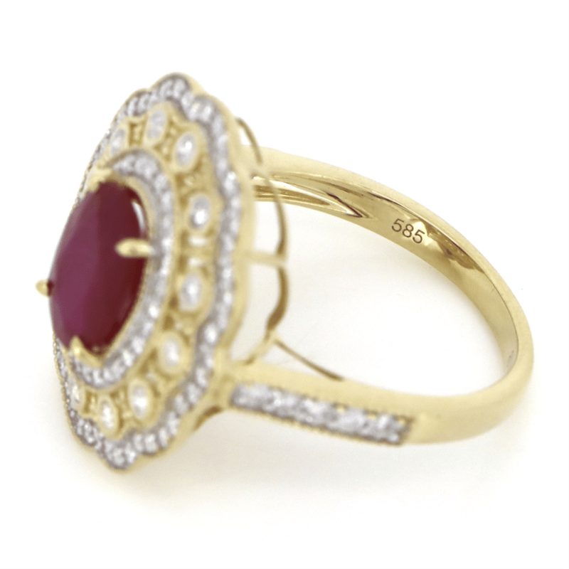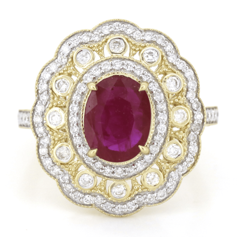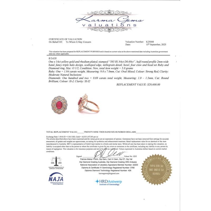 14K YELLOW GOLD, RUBY AND DIAMOND, DECORATIVE RING. THE CENTRE FEATURES, ONE OVAL CUT, STRONG RED, RUBY (1.84CT, MODERATE INCLUSIONS), 4 CLAW SET. SURROUNDING THE CENTRE AND DECORATING BAND ARE, 102 ROUND BRILLIANT CUT, DIAMONDS (0.69CT TDW, H-J COLOUR, SI-I2 CLARITY), BEZEL/BEAD SET IN WHITE GOLD. RING SIZE O 1/2. Valuations Provided by an Independent Third-Party Professional Not Directly Associated With Lloyds Auctions at AUD $29600This valuation has been conducted by an independent third-party professional. The valuation amount is an assessment by the issuing valuer and does not reflect the auction value of the item. Any inquiries regarding the valuation should be directed to the issuing valuer (refer to contact details on the certificate), as Lloyds Auctions has no affiliation or influence over the valuation, the valuer, or the stated amount. Condition: Good - Refer Images 0645863+5043